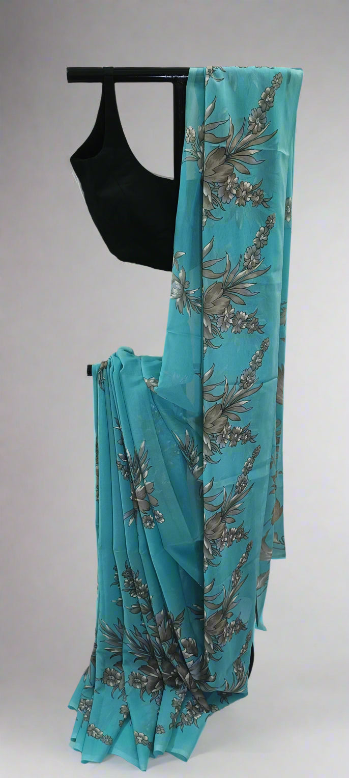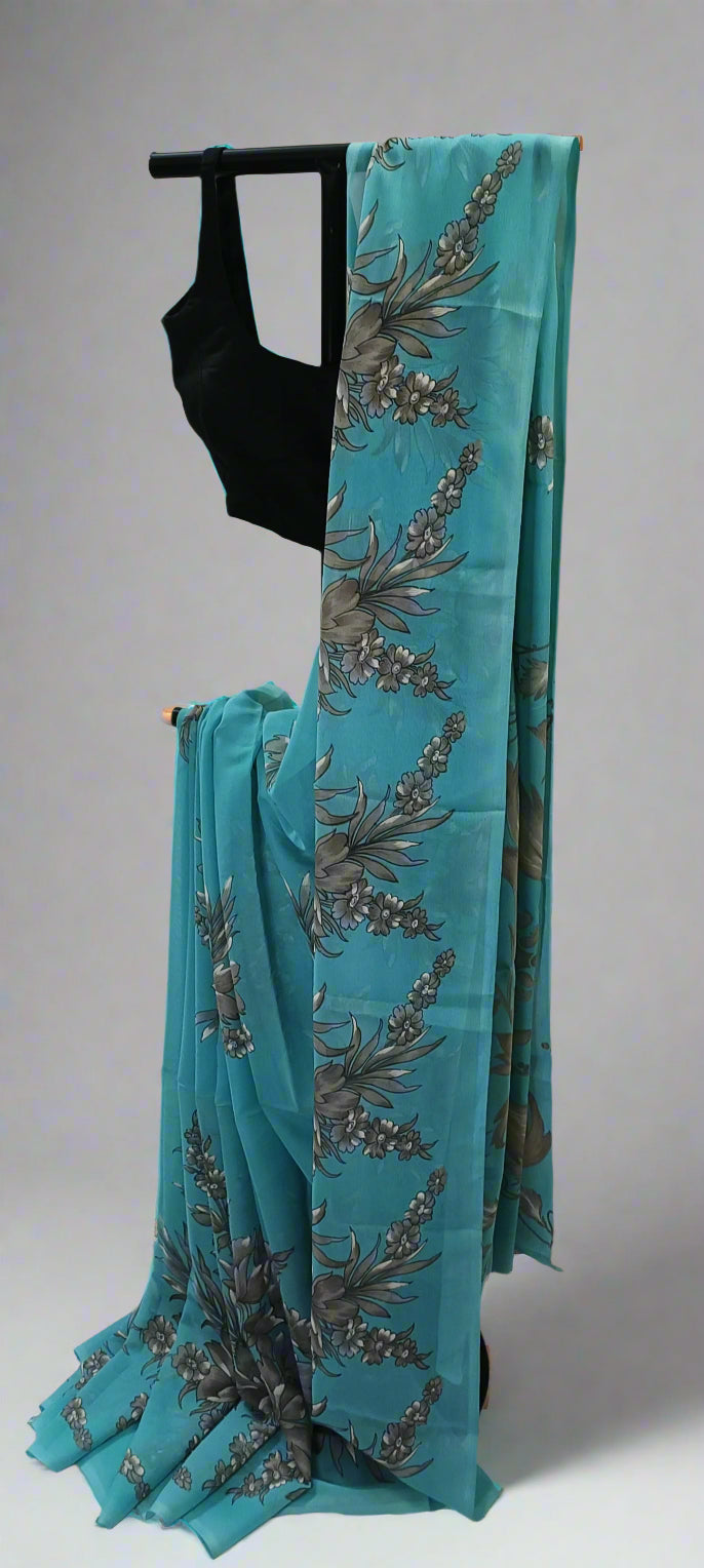 Light as the sea wind and soft to the soul, Aqua Whisper is a chiffon saree that feels like poetry in motion. The cooling aqua base with subtle grey-beige floral vines brings effortless charm and composure, making it an elegant pick for day outings, workwear, or light festive moments.