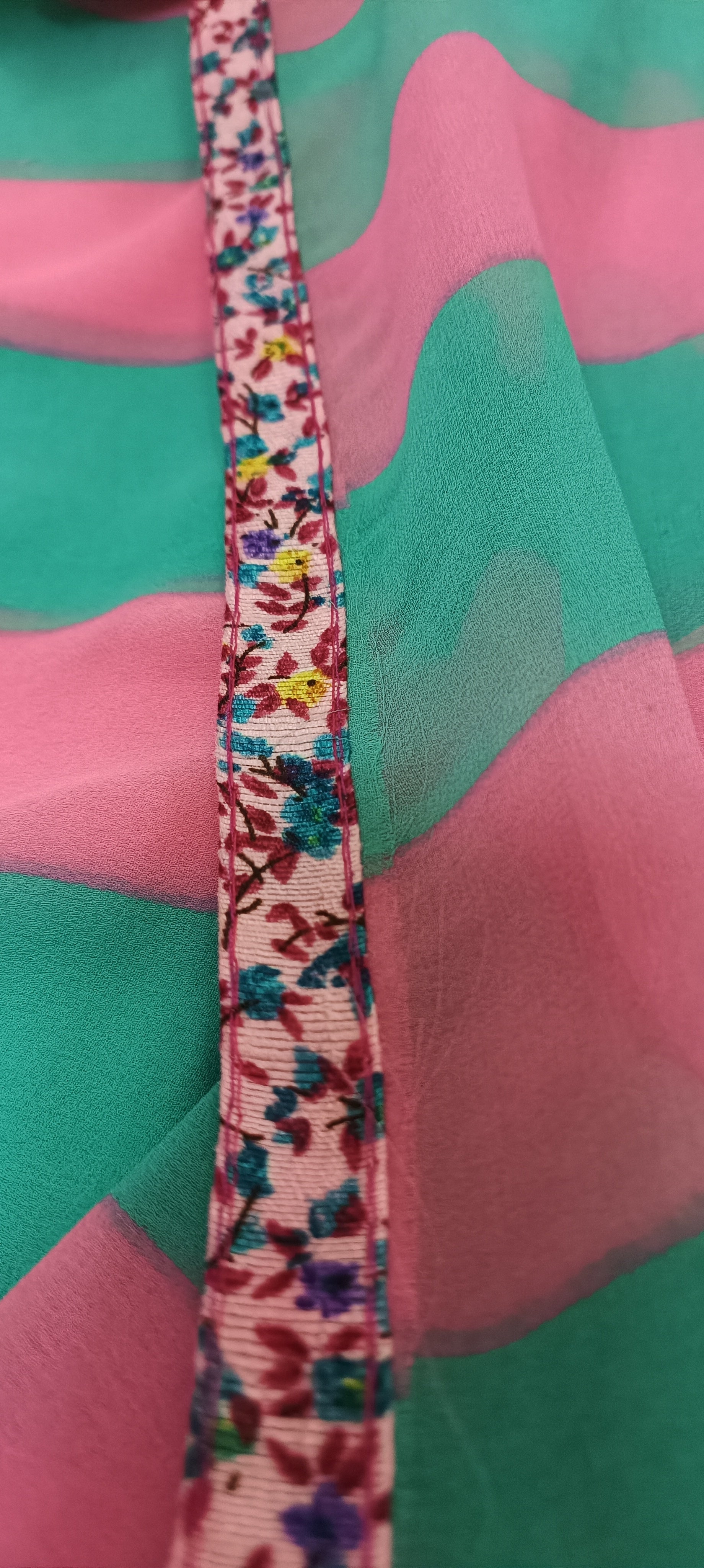 Step into playfulness with HIYA – Bubble Mint & Blossom, a breezy chiffon saree drenched in wide mint green and soft pink stripes. Its light-as-air drape and floral printed border add a whisper of whimsy, while the cool palette invites a mood of lighthearted elegance.