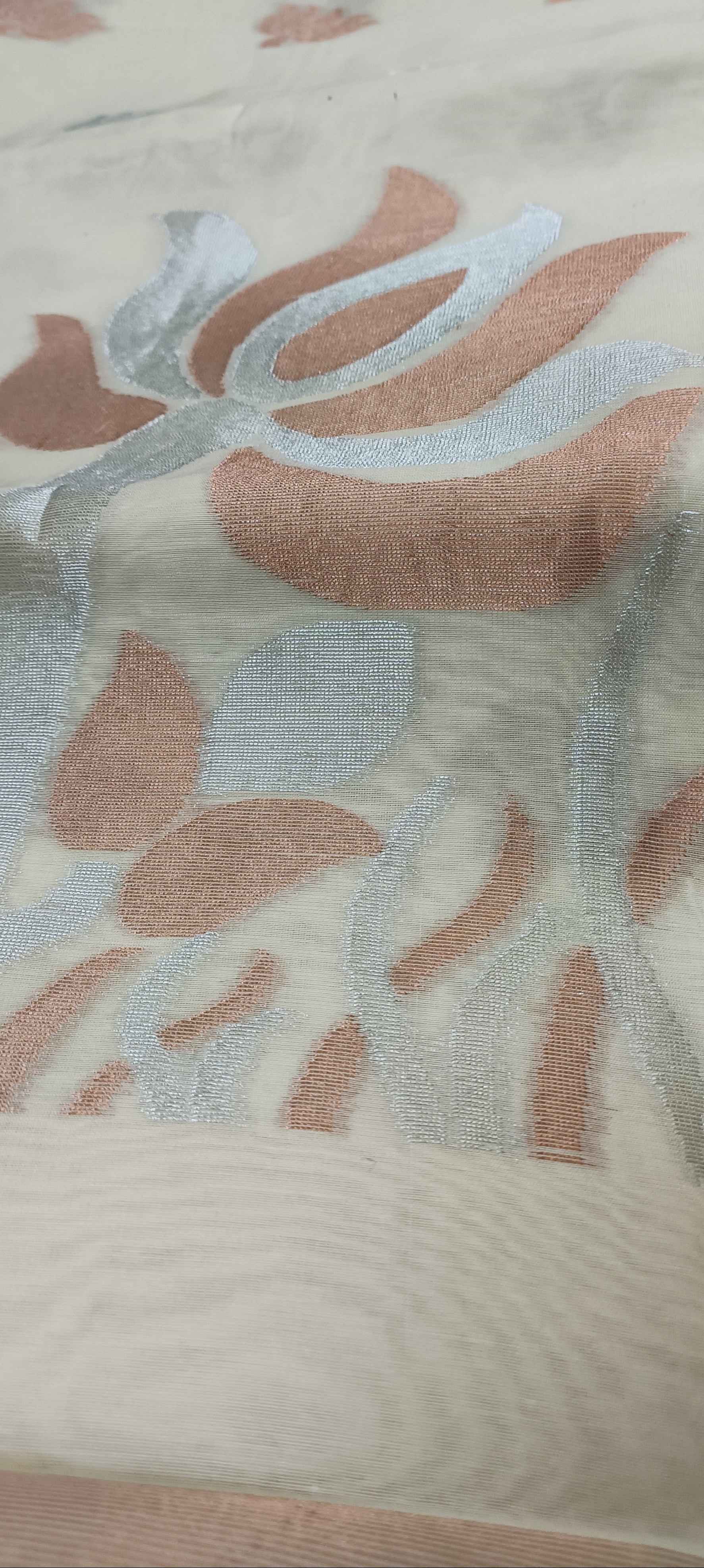 CHANDRAPUSHPO is a handcrafted Jamdani saree in a serene cream hue with delicate metallic woven florals in silver and gold tones. Accented with soft peach borders and a woven pallu, it is an elegant tribute to quiet luxury. From the HASI Collection, this piece is made for those who carry their stories with serenity and style