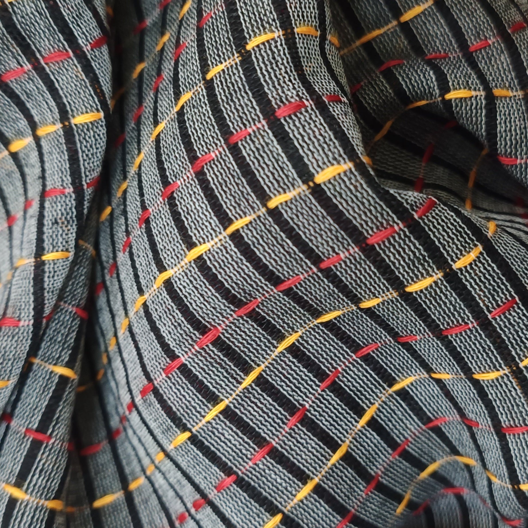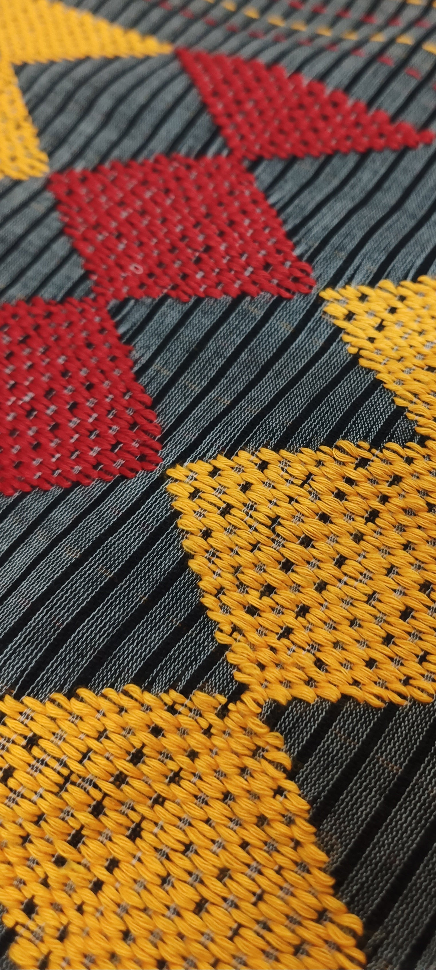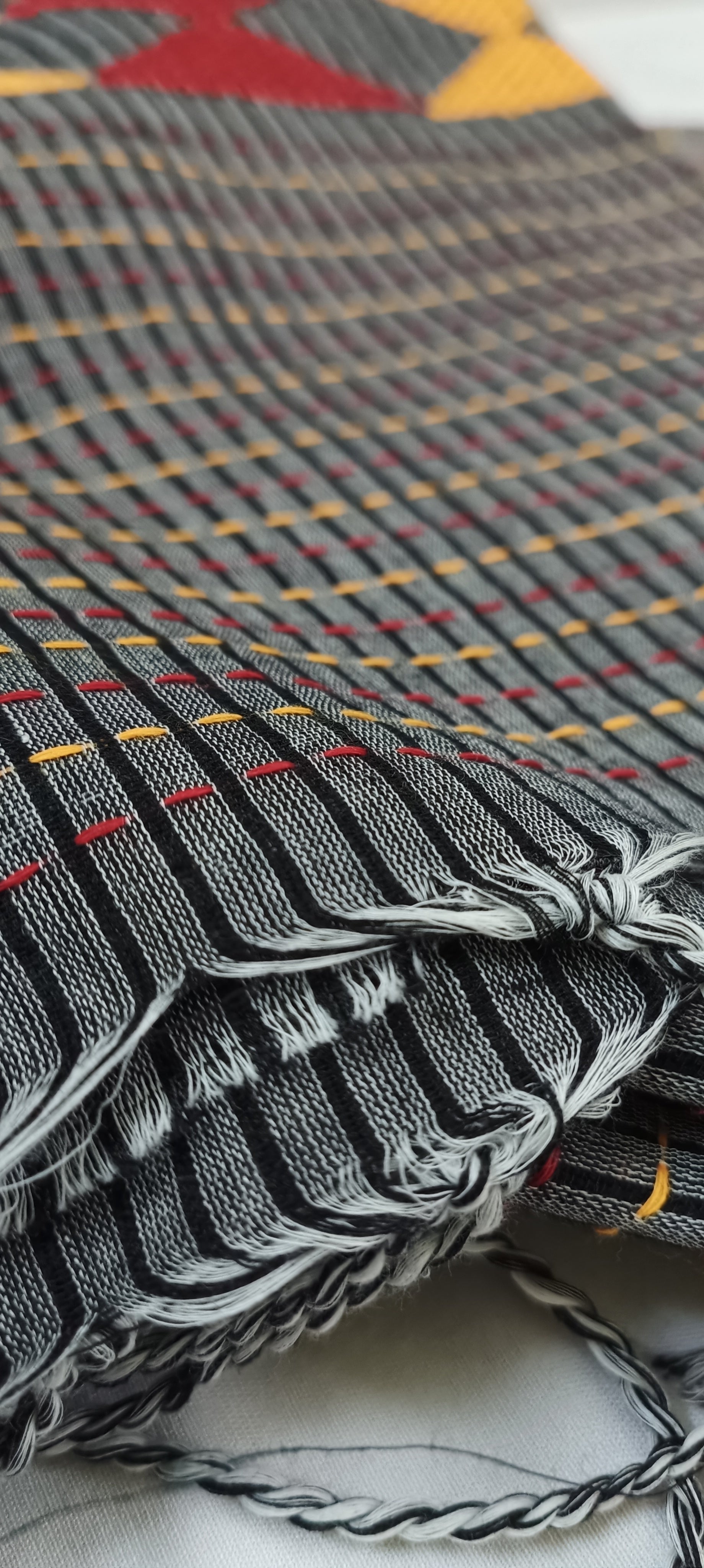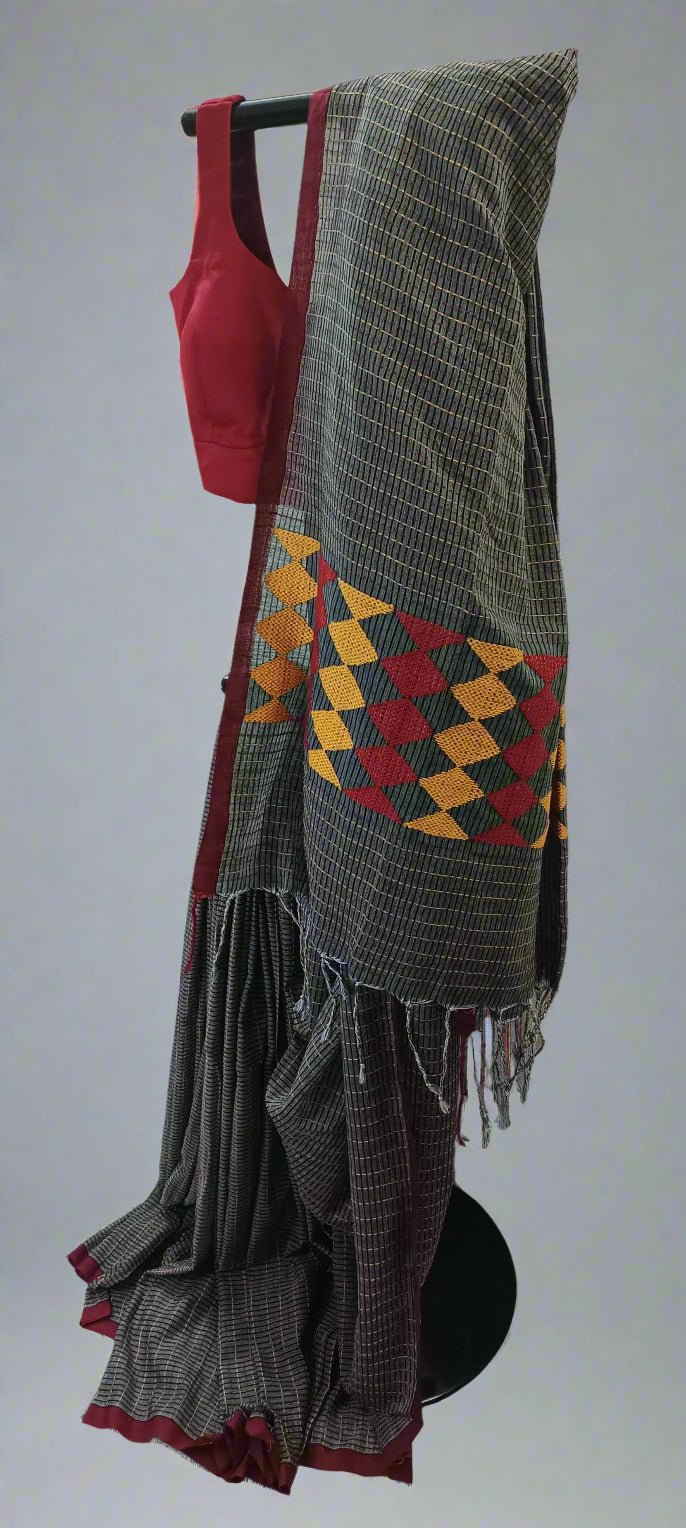 Celebrate timeless tradition with HASI – Charcoal Mosaic, a handwoven cotton saree adorned with delicate kantha stitch work in hues of mustard and deep red. The structured grid-like body flows seamlessly into a bold, embroidered pallu featuring festive diamond motifs, contrasted by a maroon border for grounded elegance. Lightweight and soft against the skin, this saree is especially crafted for dignified grace and comfort—perfect for women who embody warmth, wisdom, and quiet strength