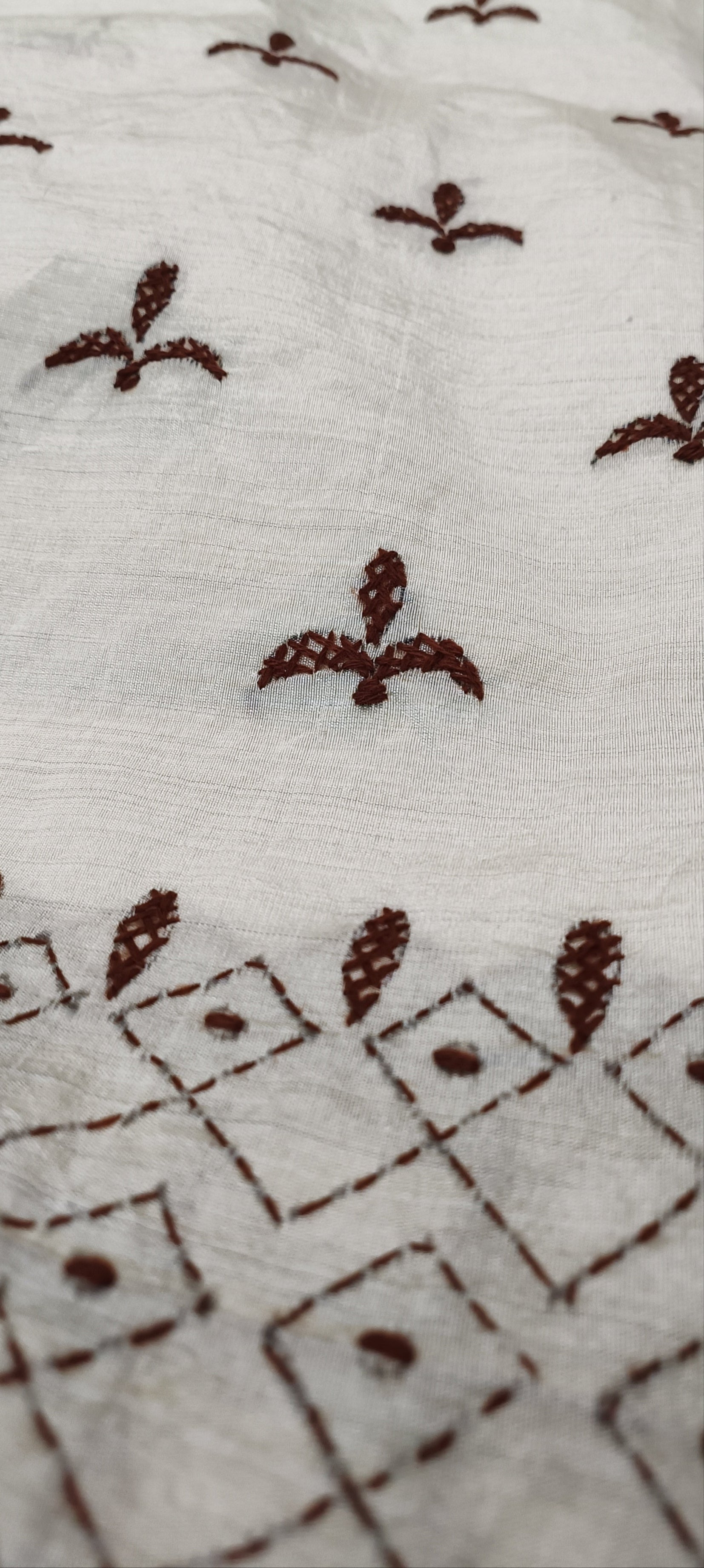 Graceful and grounded, the Shantimay Dhaga saree is a hand-embroidered Kantha stitch beauty crafted on fine silk. Its earthy brown motifs spread across an ivory base exude a quiet strength—perfect for the mature, mindful woman.