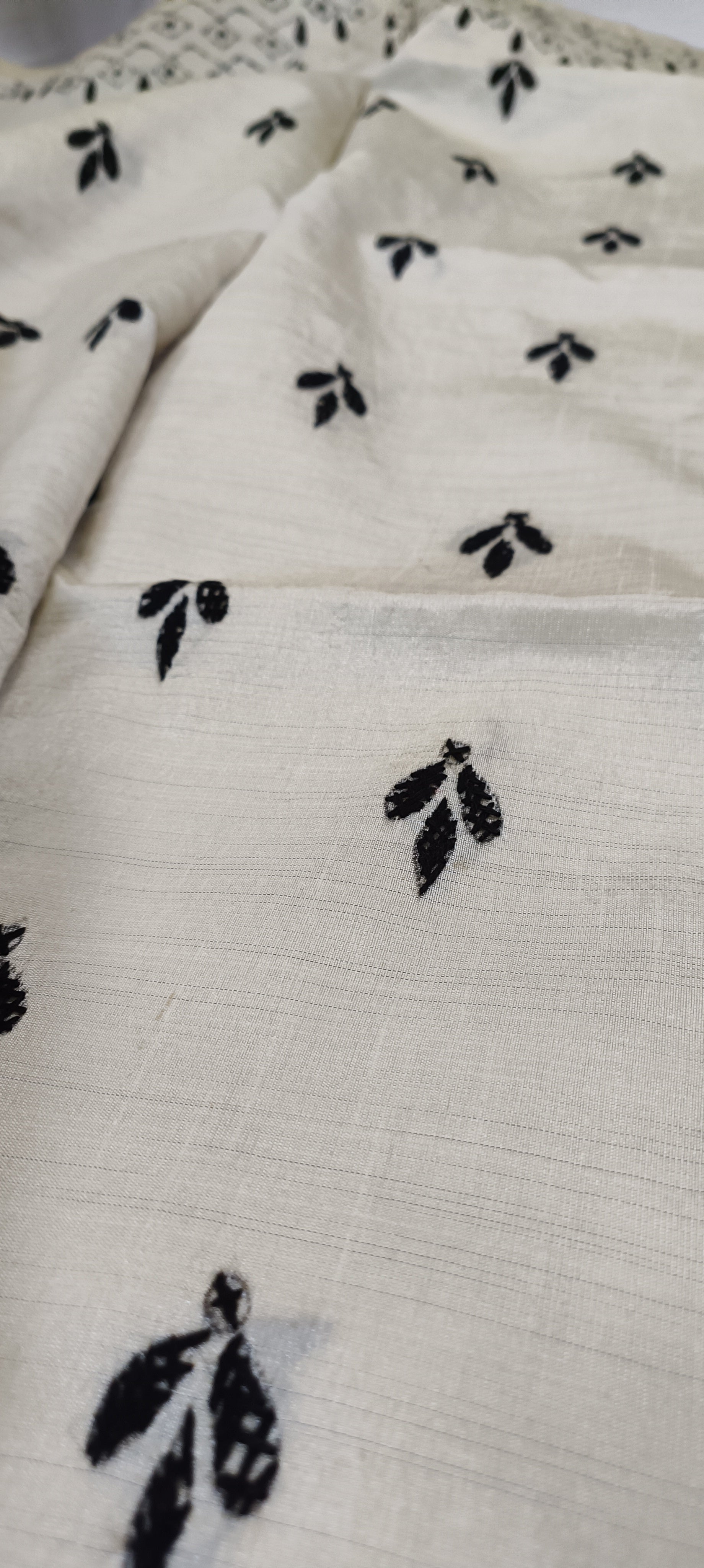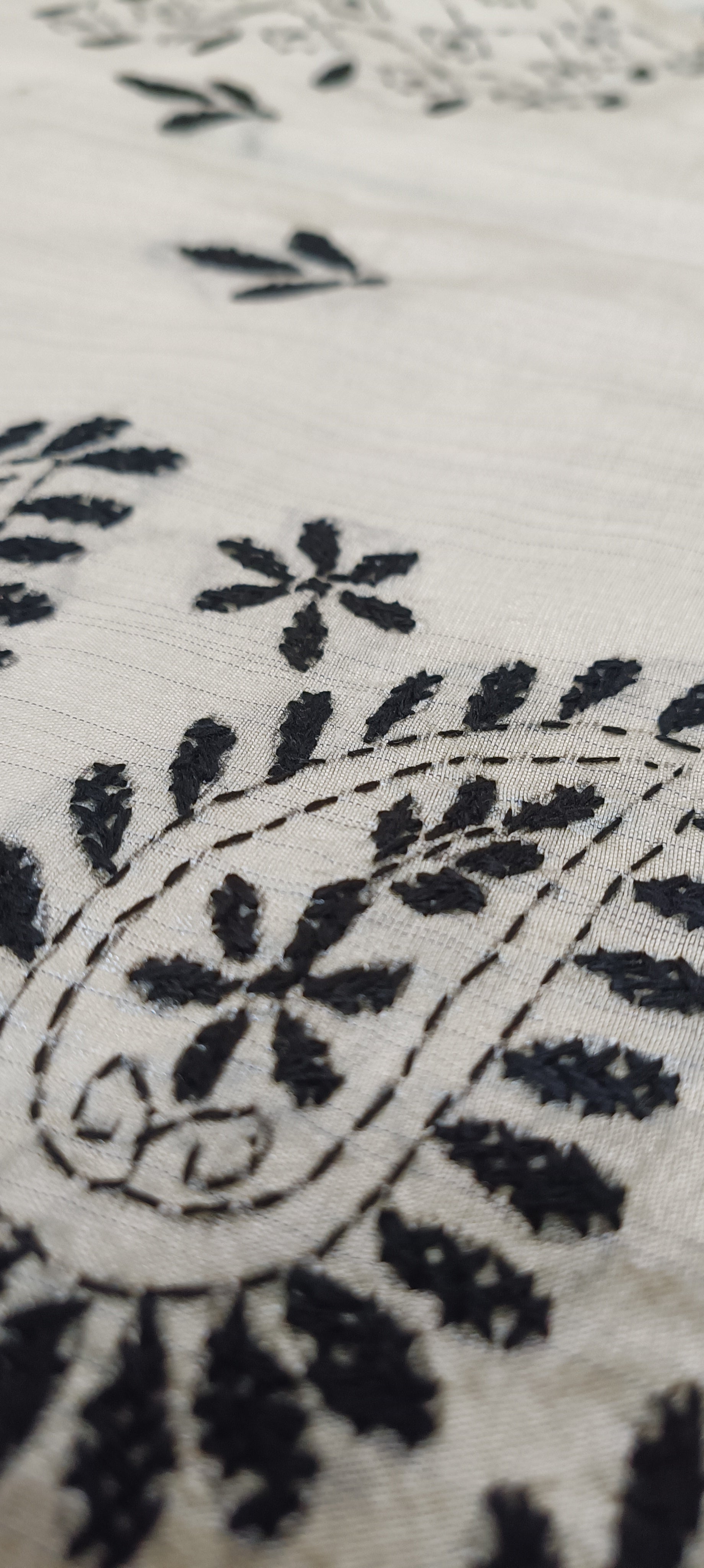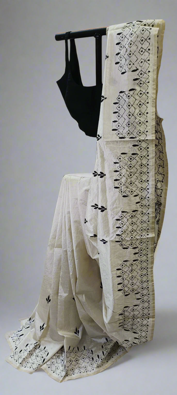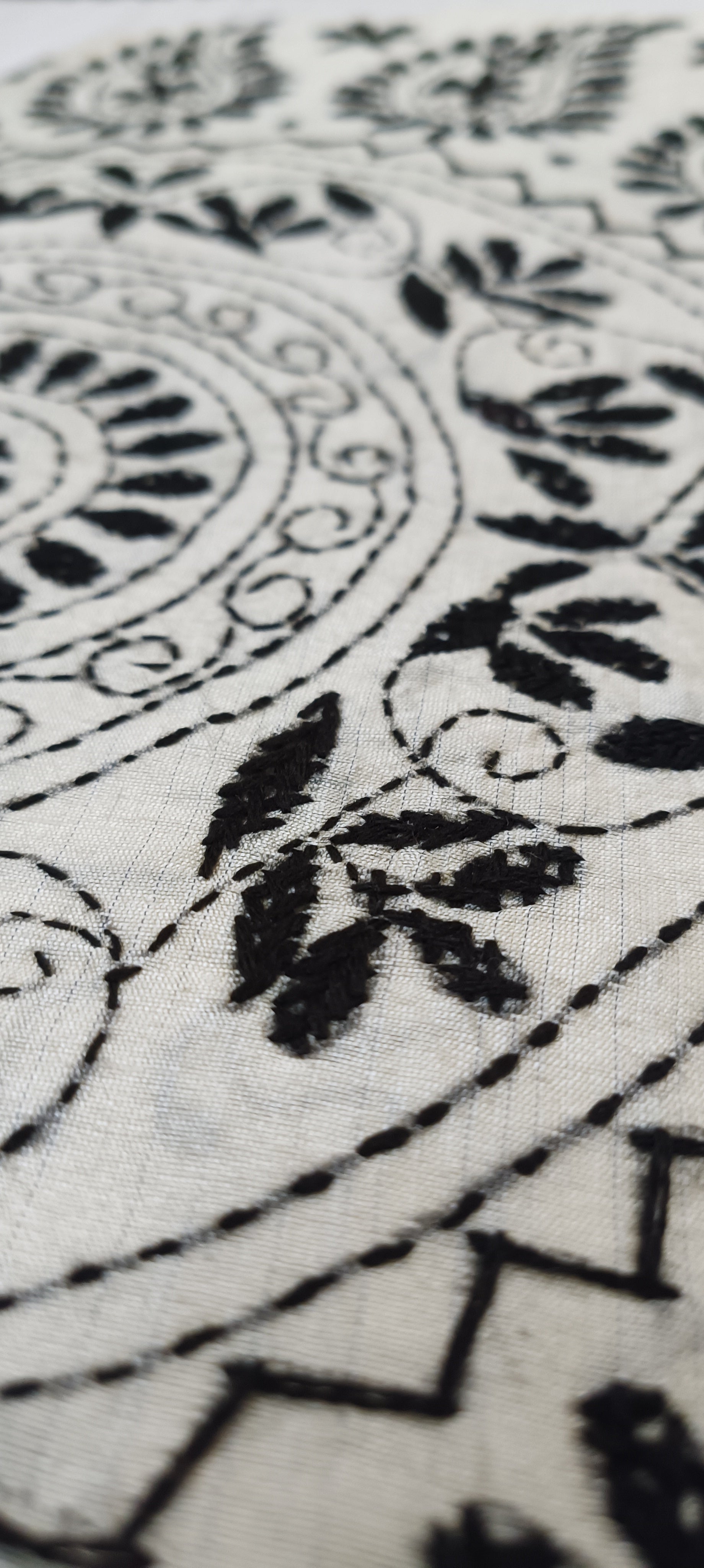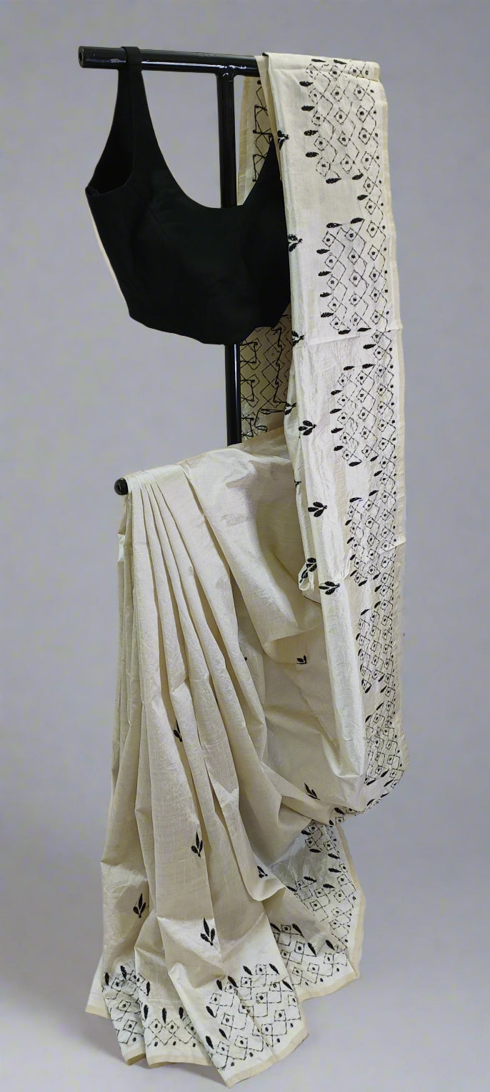 Step into quiet luxury with HASI – Shwetra–Noir, a handwoven silk saree in natural ivory, detailed with striking black Kantha embroidery. Every motif is hand-stitched by rural women artisans, reviving Bengal's oldest embroidery tradition in a modern, breathable, and elegant drape.