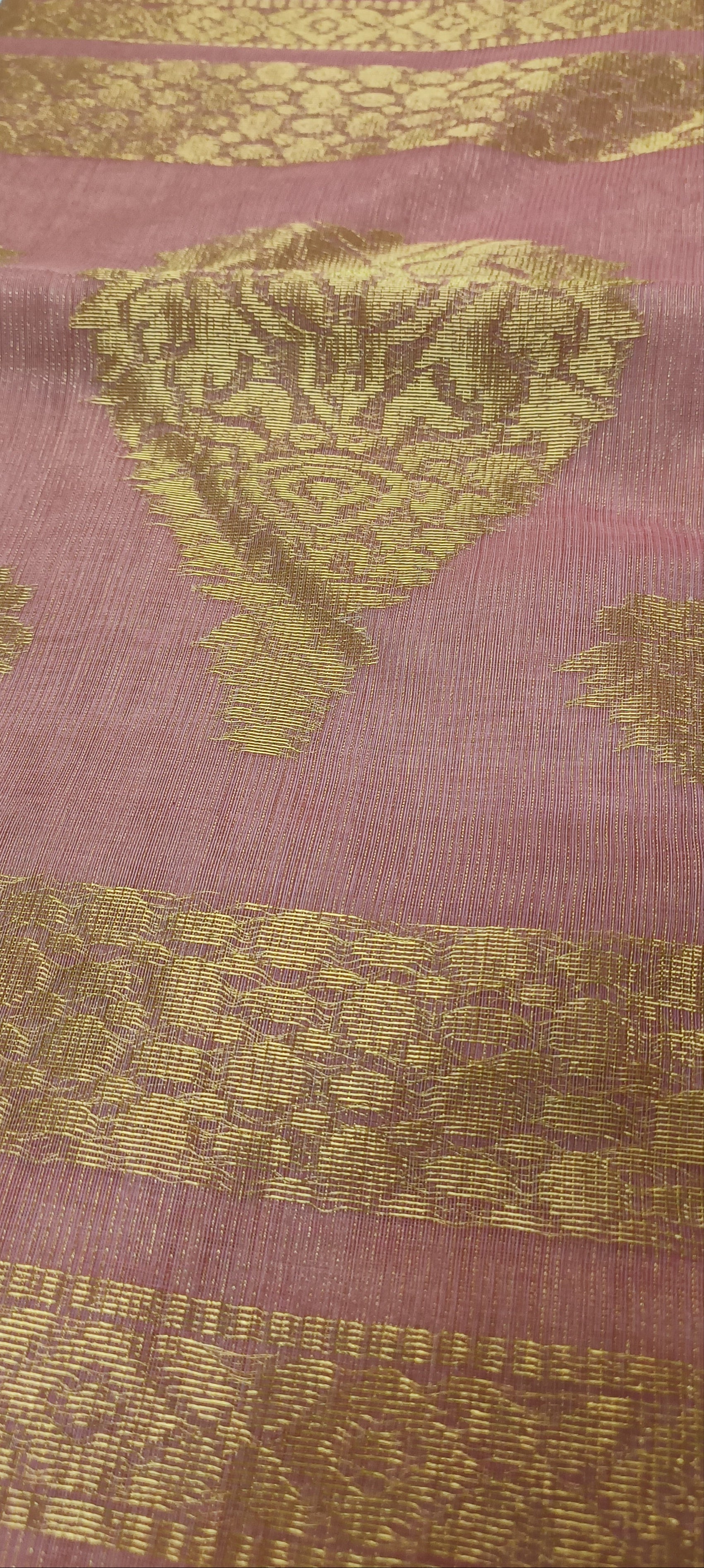 Breathe in the warmth of heritage with HASI – Sondhi Gulabi, a premium Tissue Muslin saree that softly glows with every fold. Ideal for women who cherish subtle luxury, this saree from Hasya’s HASI Selection honours elder grace with its featherlight drape and golden zari motifs