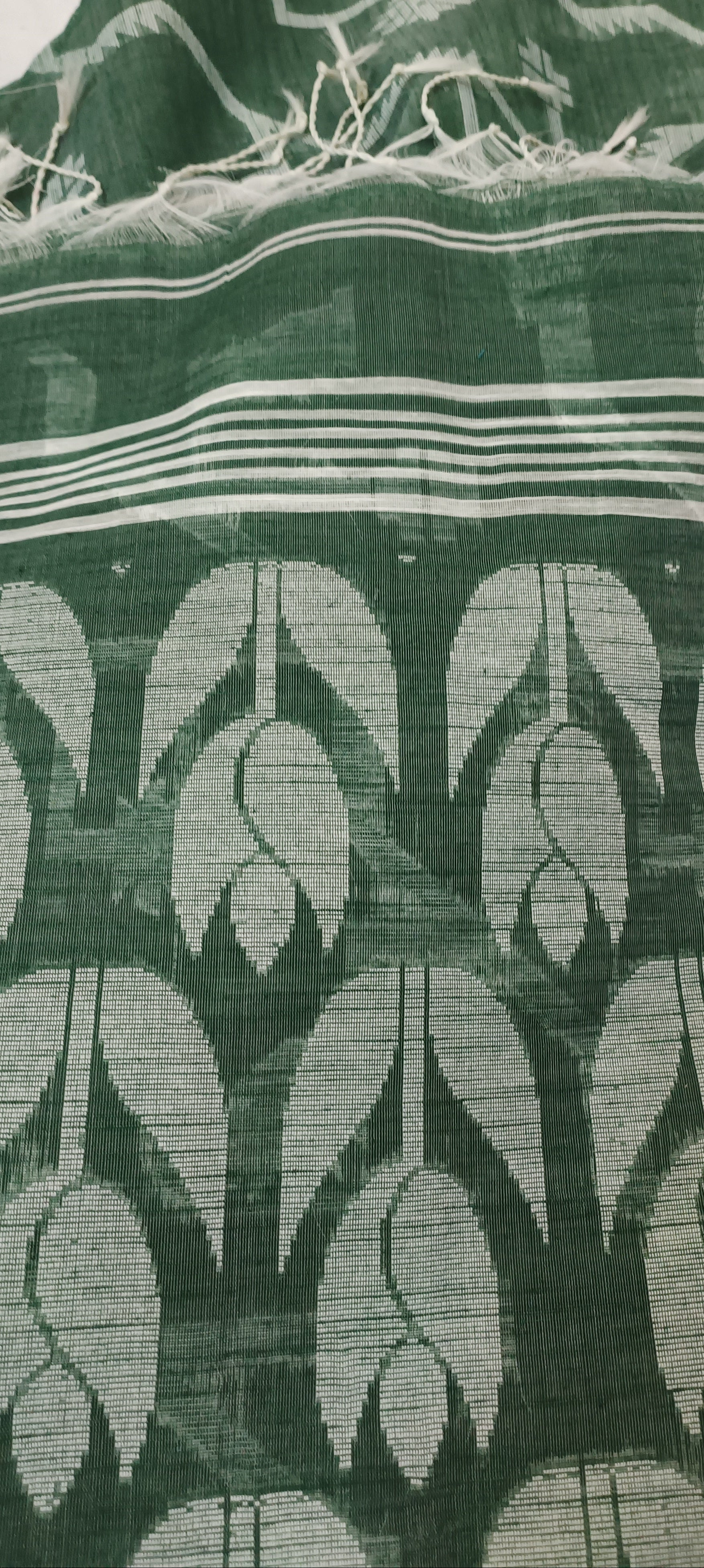Step into subtle heritage with Vanira, a rich green muslin cotton saree from the HASI Selection. Adorned with tribal-inspired white motifs and symbolic floral borders, this saree feels airy on the skin and soulful in presence. Woven for women who love understated depth and effortless beauty
