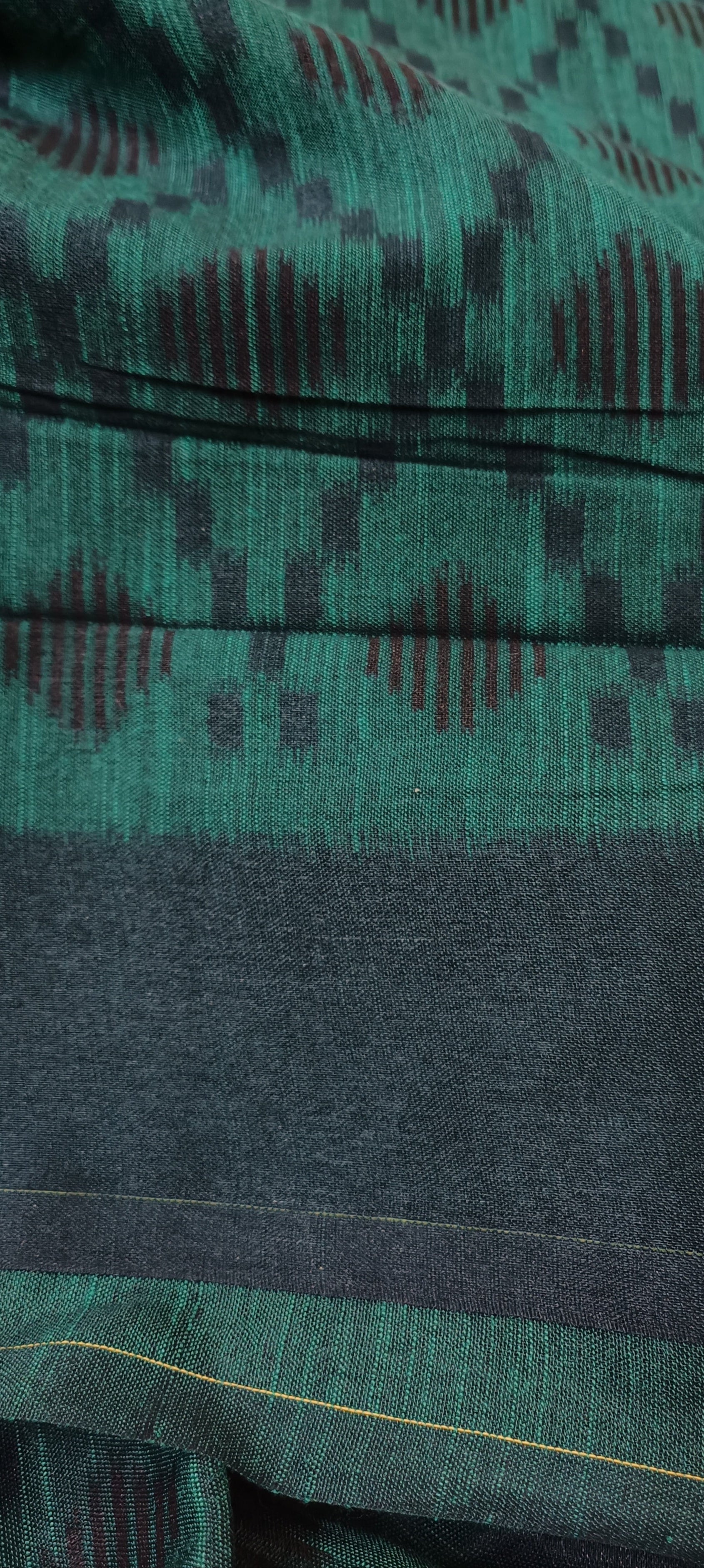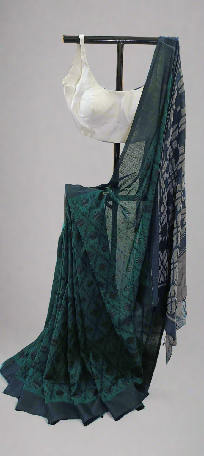 Color - Deep forest green body with black kotki weave and navy contrast pallu