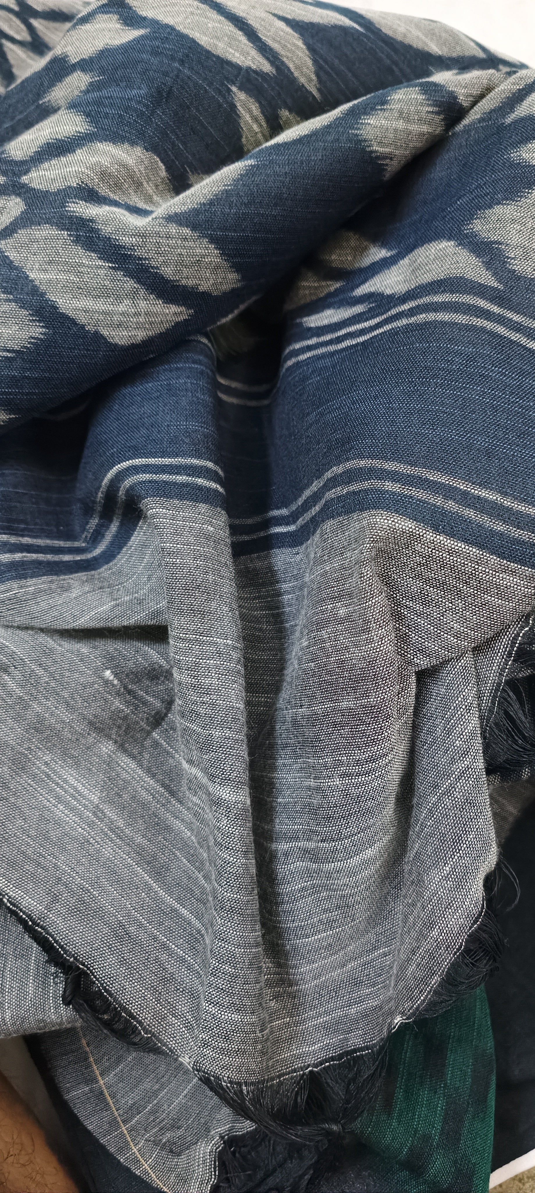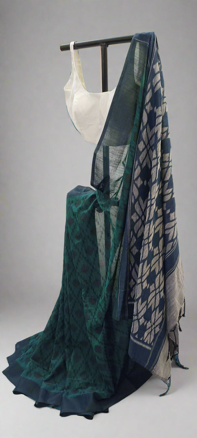 Introducing Aabhosh, a handcrafted Kotki Cotton Saree from the Hiya Collection. With a beautifully textured green body and striking navy pallu featuring silver geometric motifs, this saree is designed for expressive elegance. Lightweight yet impactful, it’s perfect for those who find beauty in subtle contrast and handwoven texture