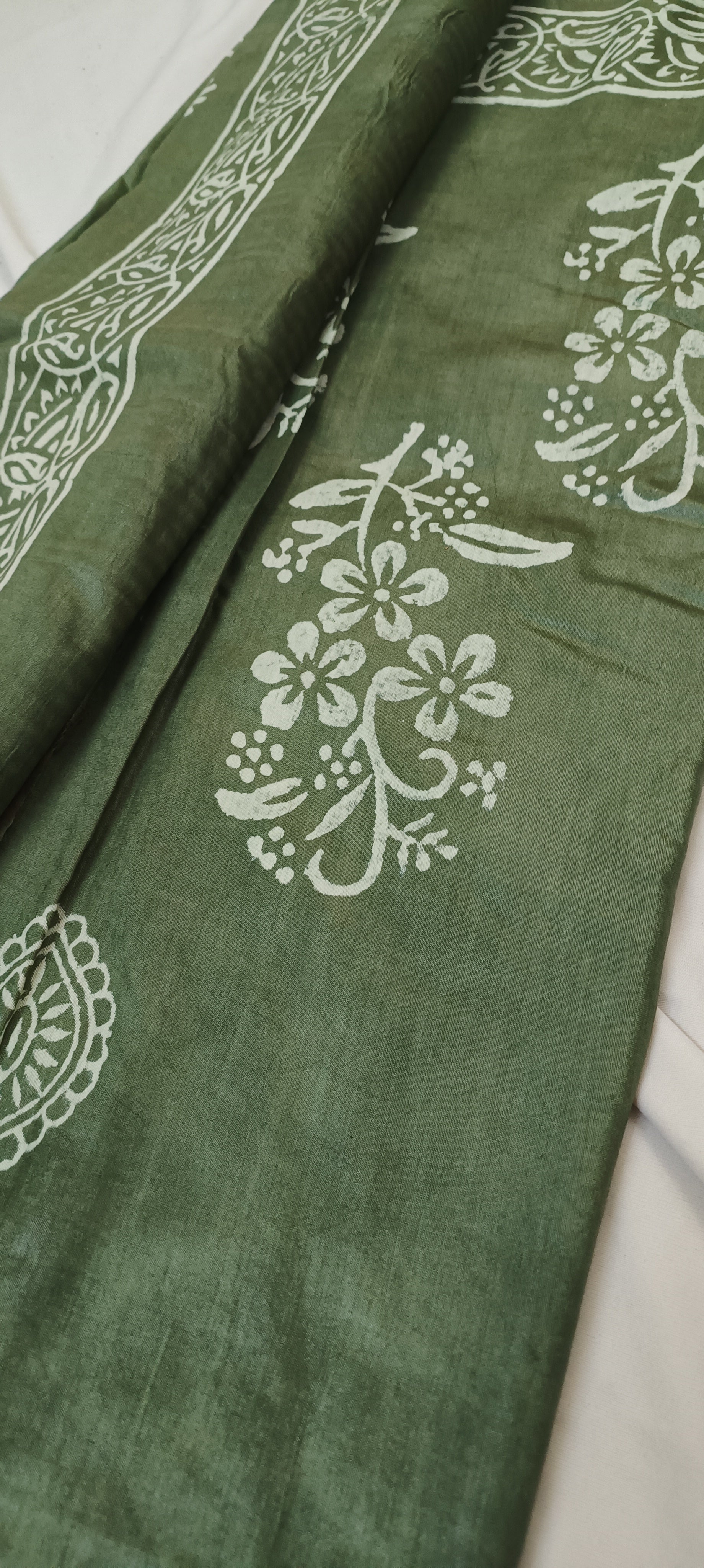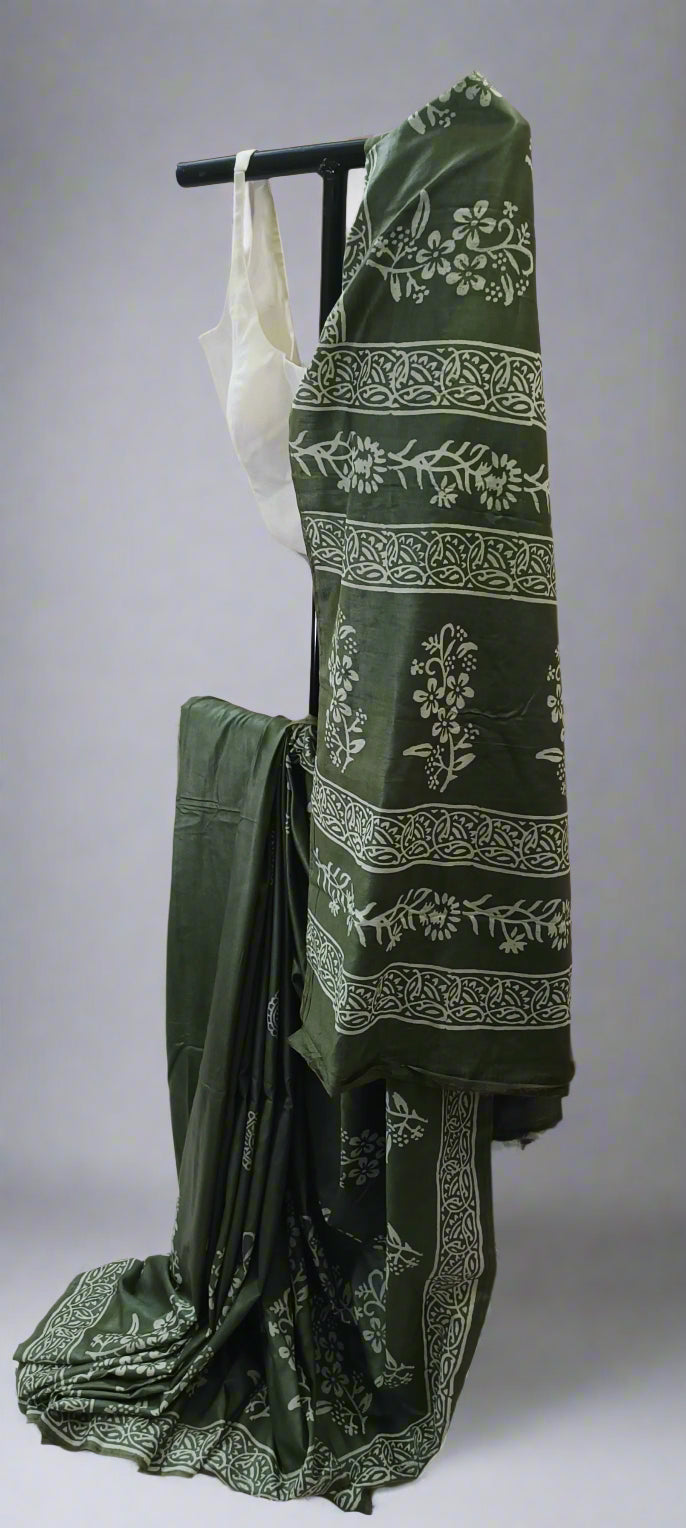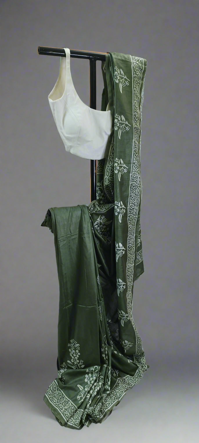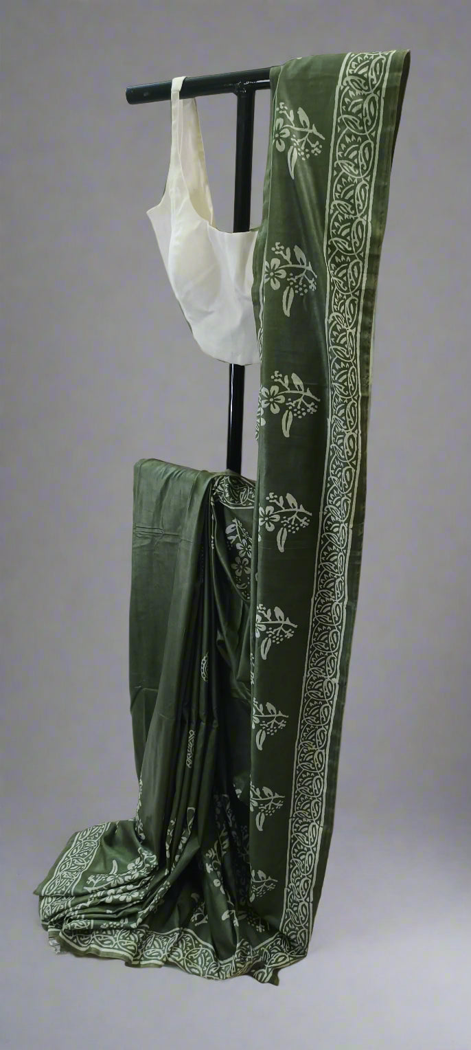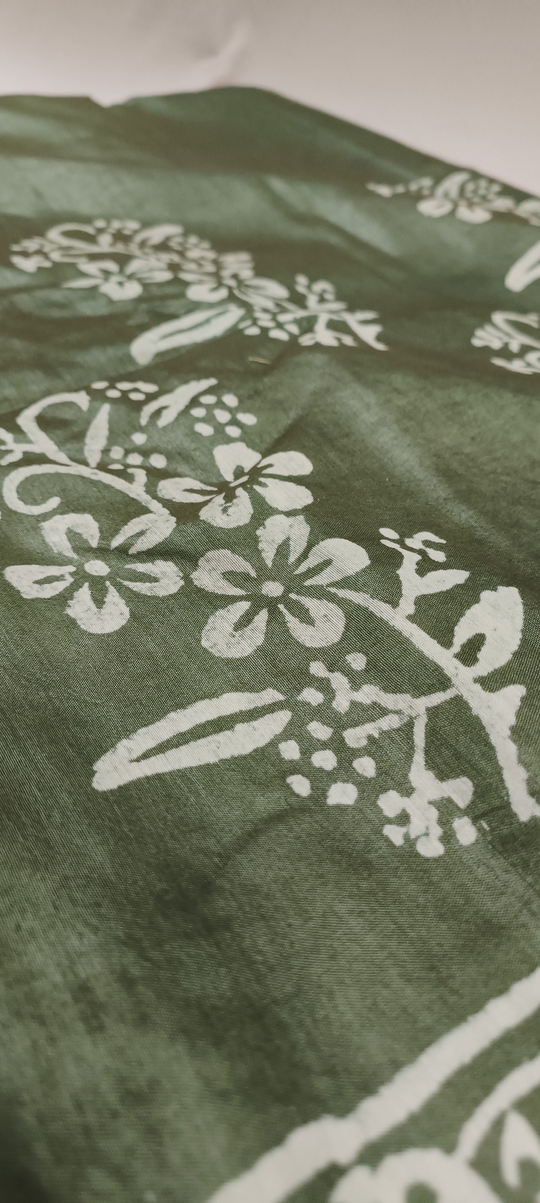Rooted in tradition, flowing with grace — Anant Vriksha evokes the serene sanctity of a forest temple. Crafted in Bishnupur's signature silk-cotton blend, this hand-block printed saree is rich in green with elegant white floral vines and temple-style borders. Subtle in its poise, it’s perfect for spiritual gatherings, elder blessings, or a deeply personal moment of stillness