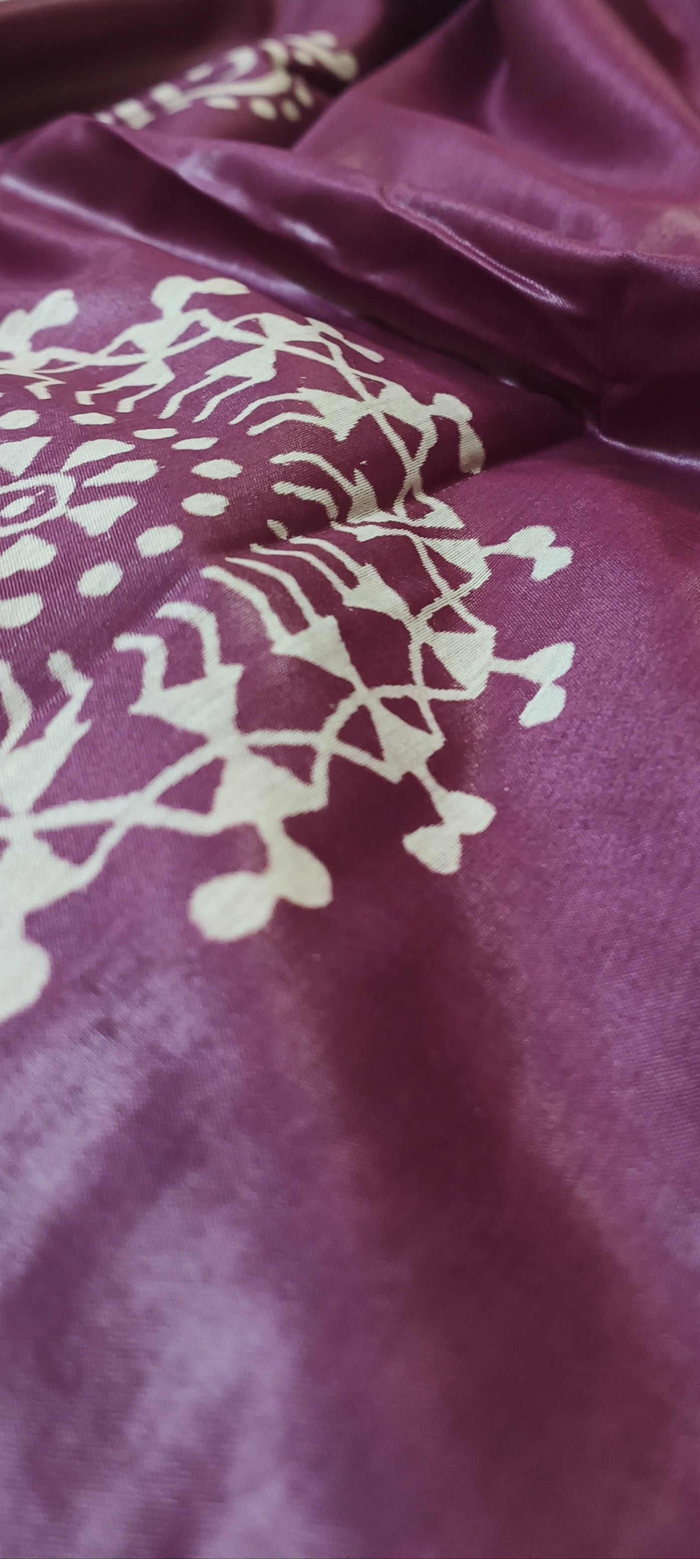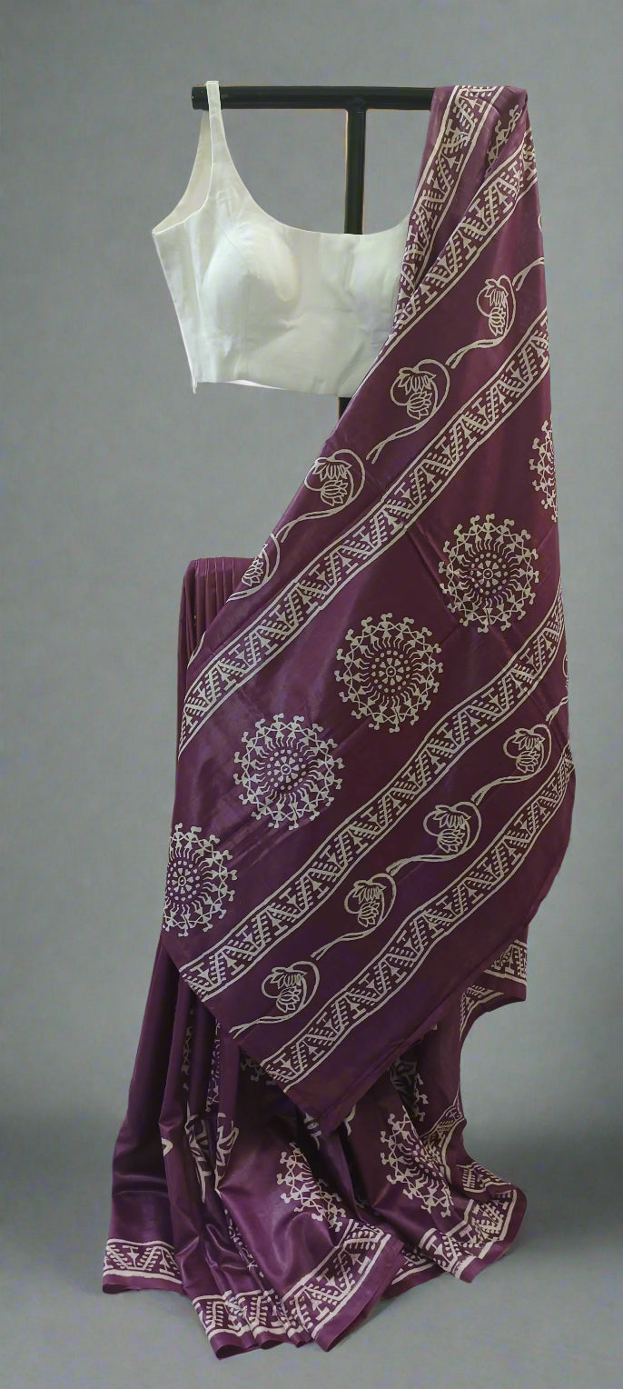 Drape yourself in heritage with HIYA – Anurakta Jamuni, a cotton silk Bishnupuri saree block-printed in Bengal’s age-old craft tradition. The deep jamun hue reflects quiet power and grace, while the off-white motifs echo ancient symmetry and folk memory.