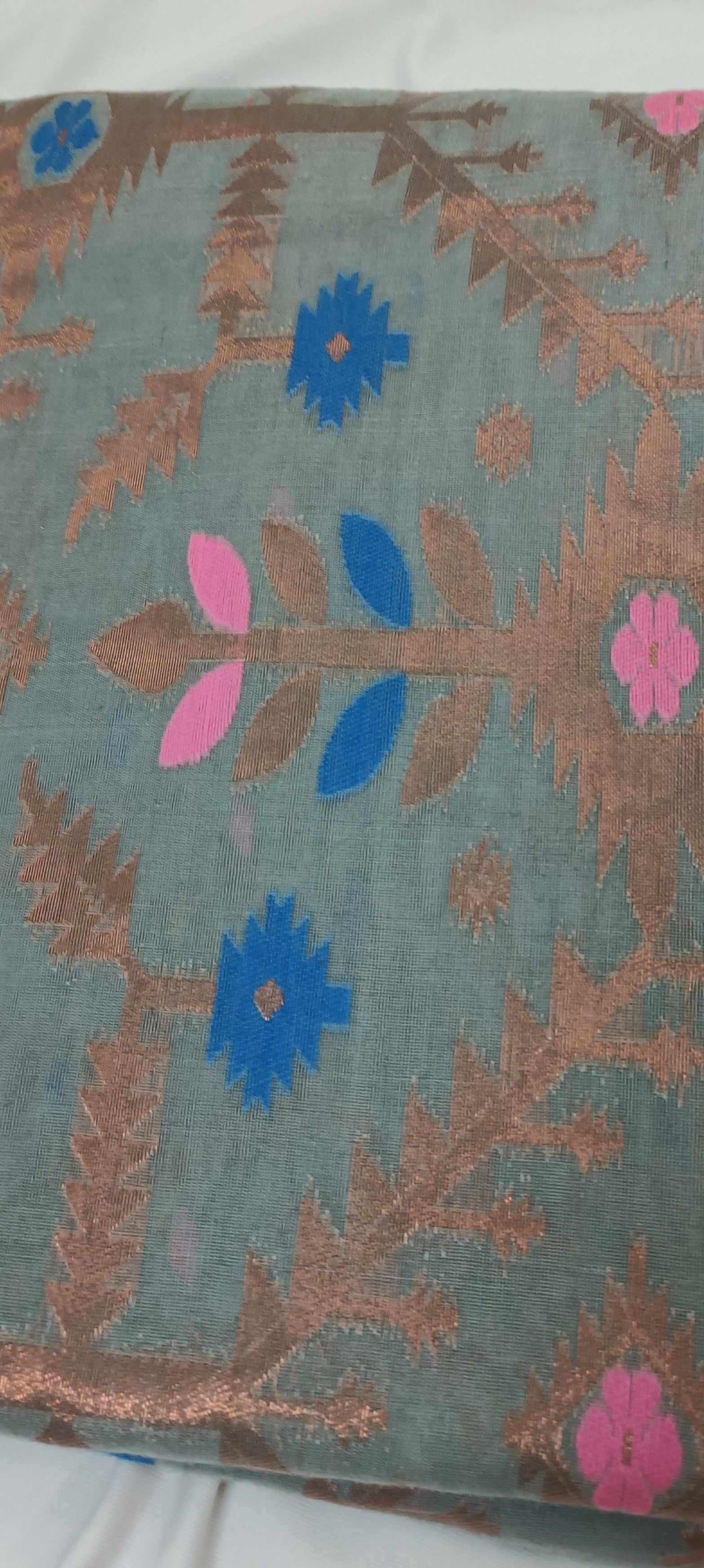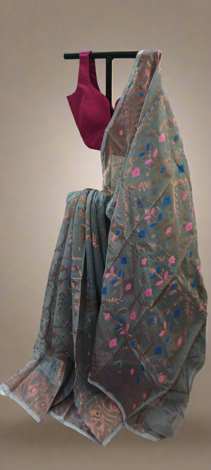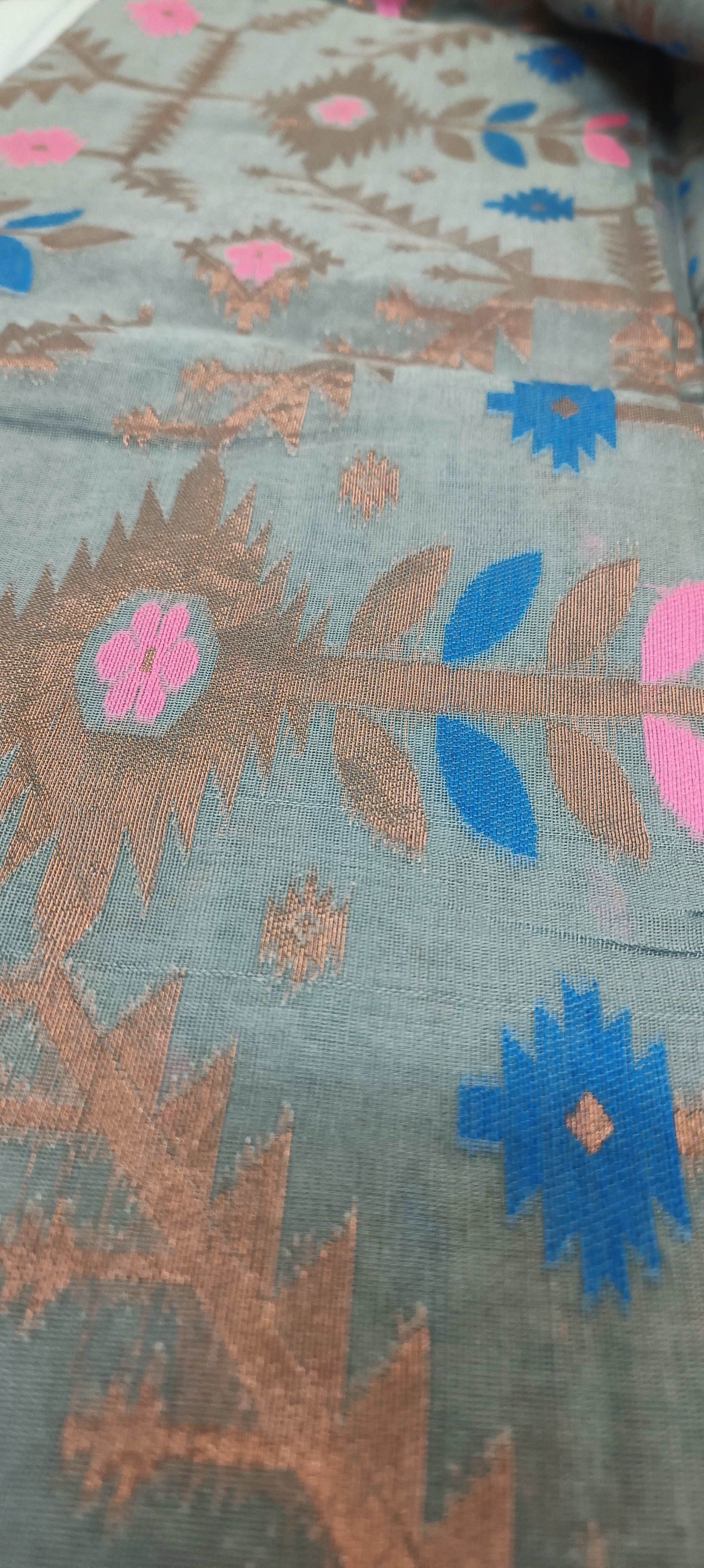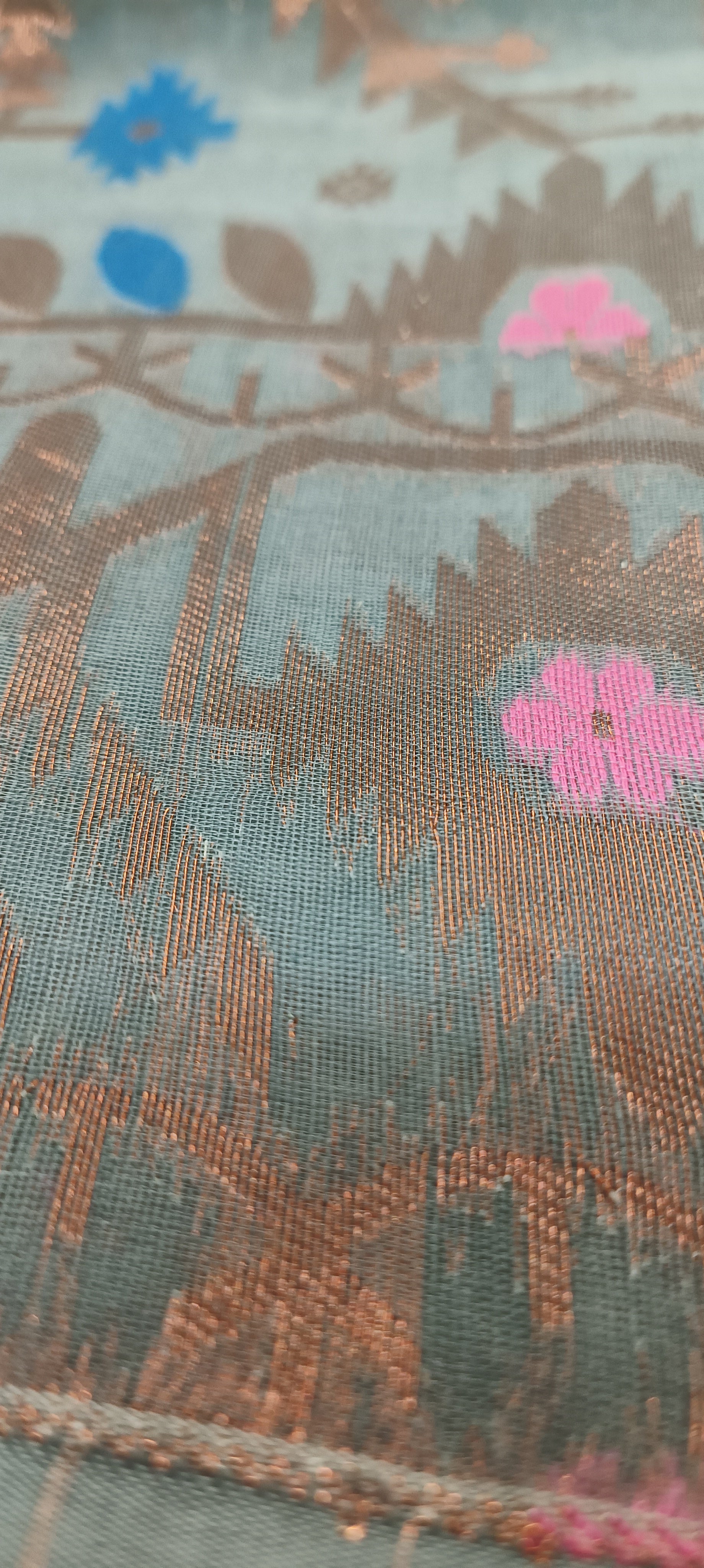 Color - Dusky teal-grey with bronze zari weave, Pink and blue floral accents