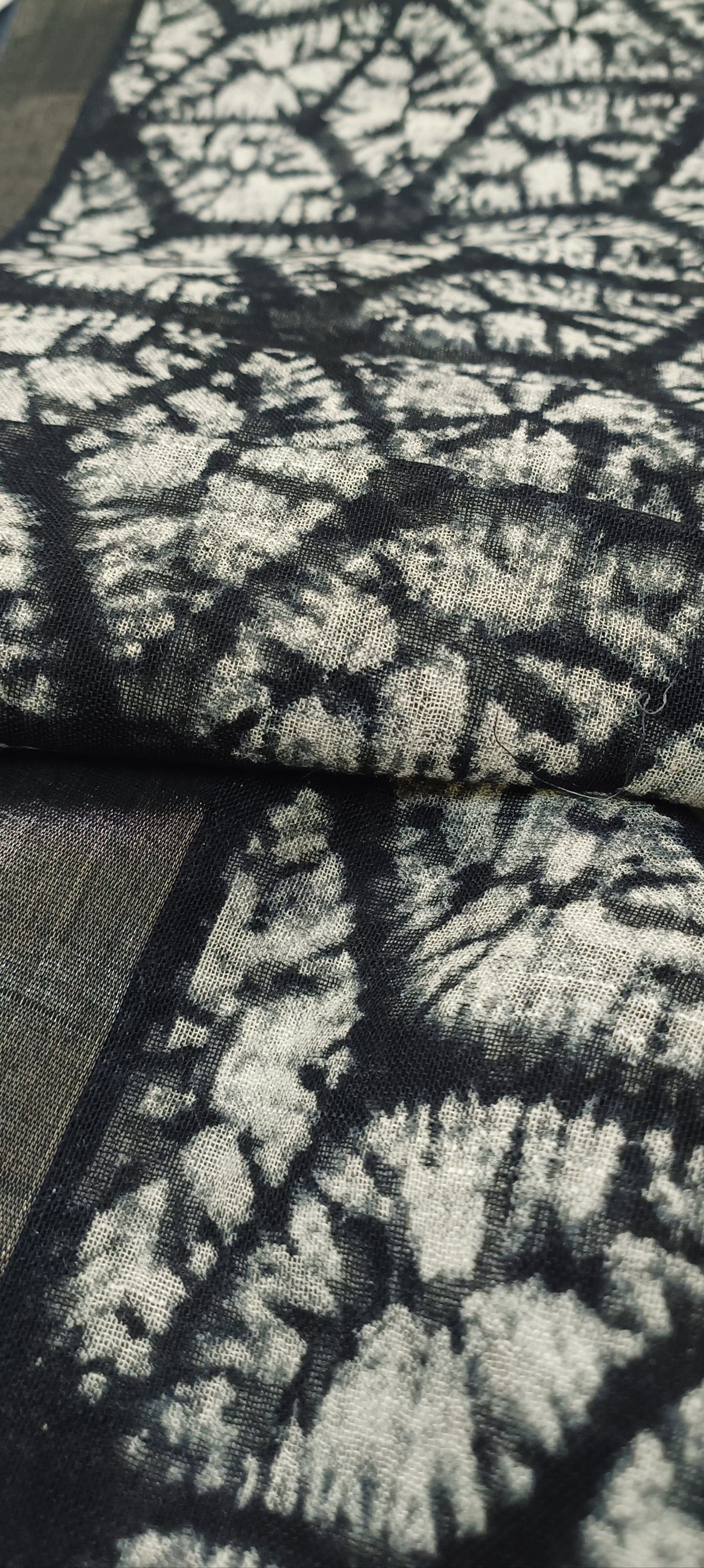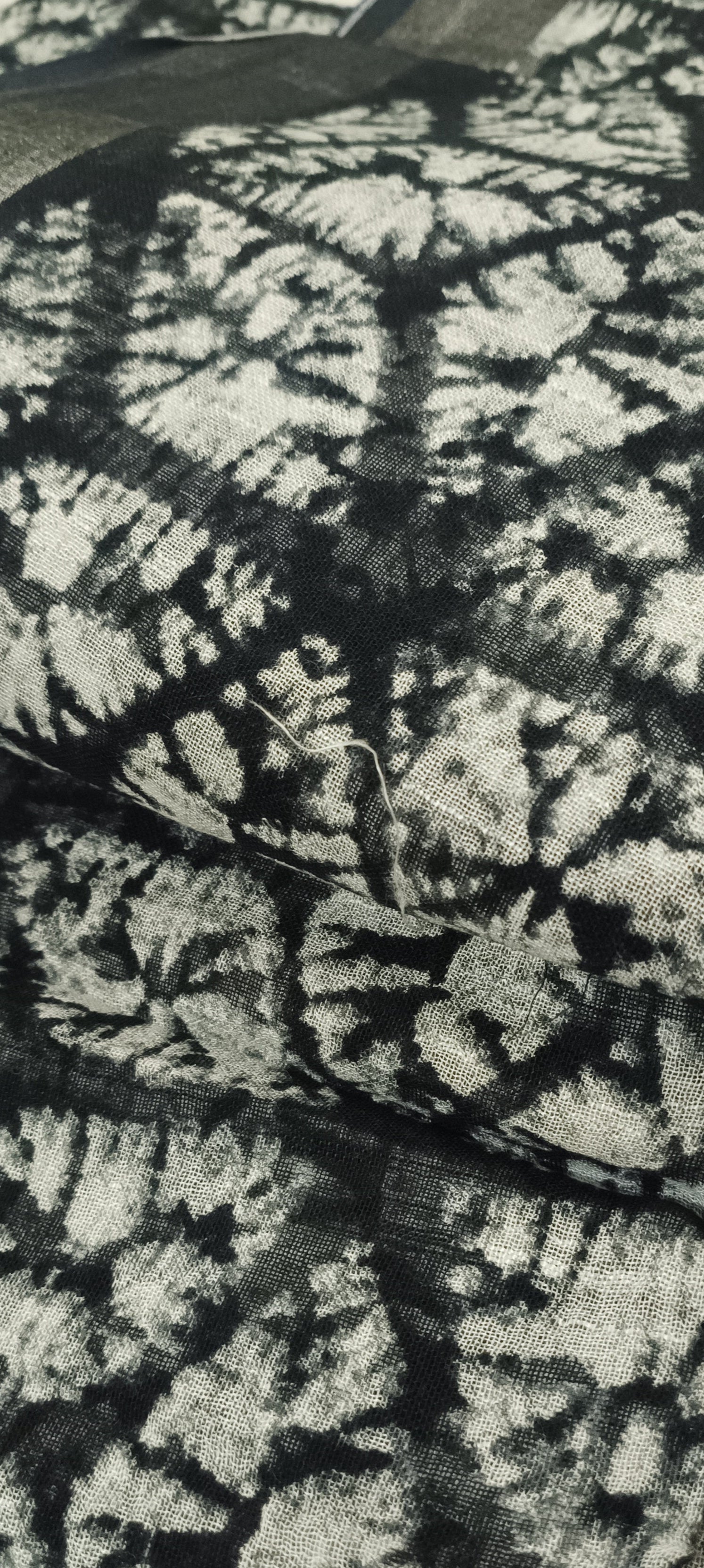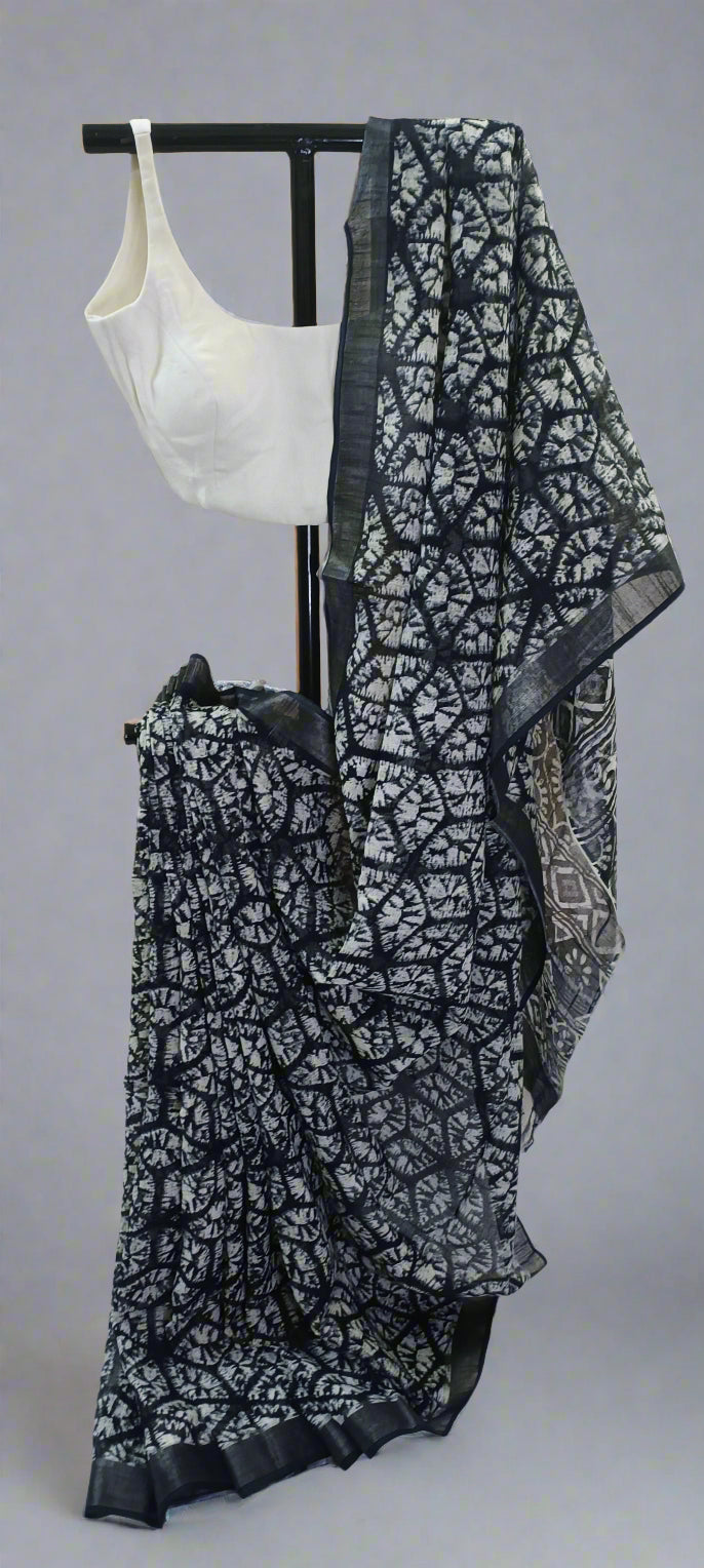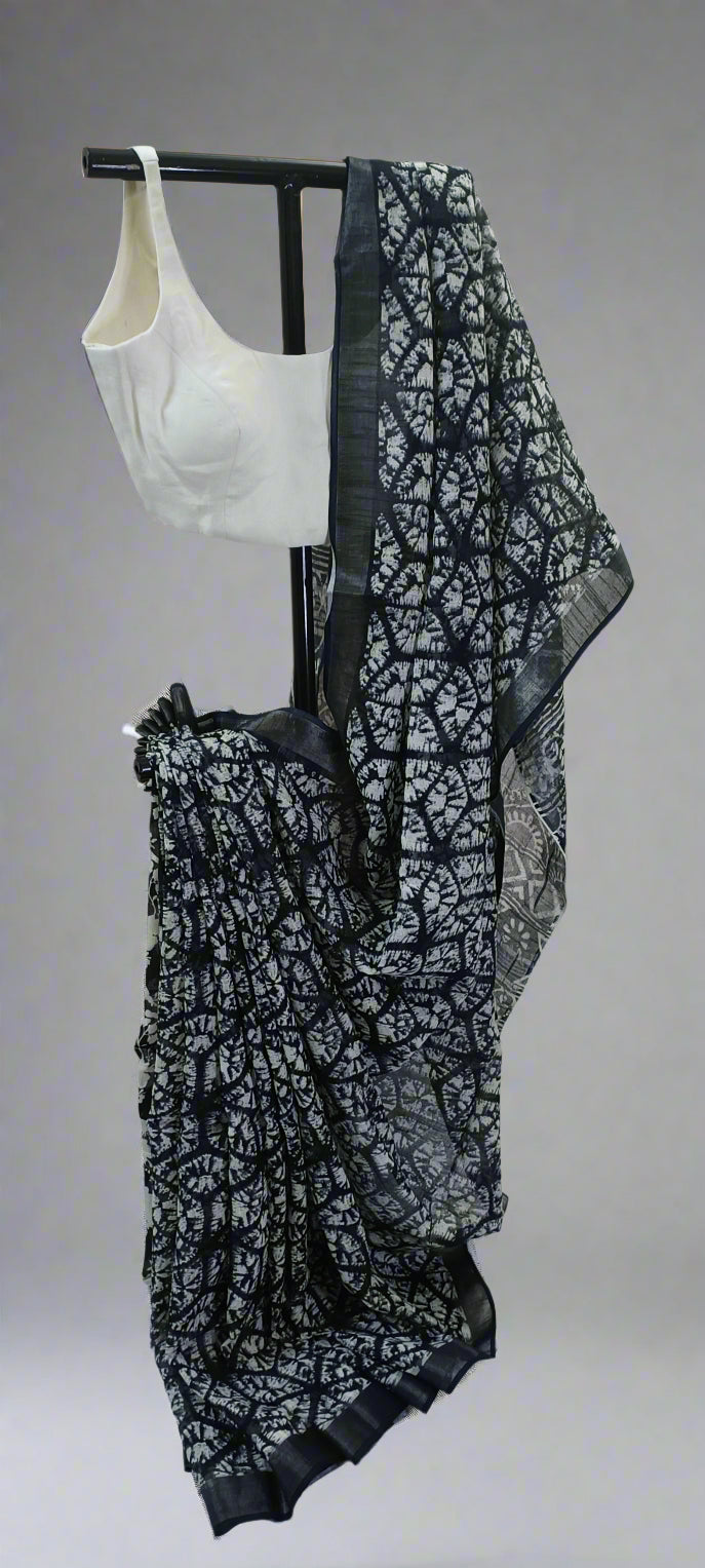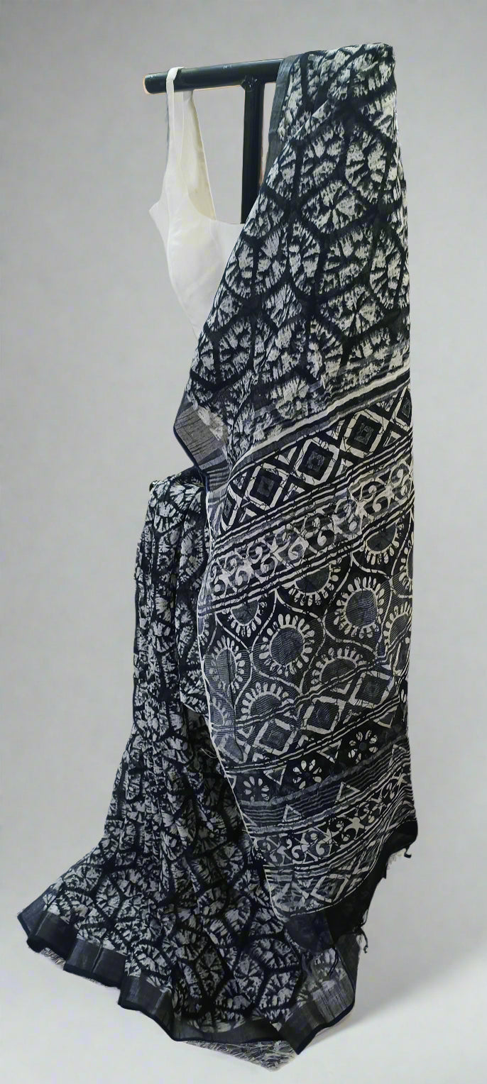 Let your style echo the spirit of the ancients with the HIYA – Eclipse Shadow Ajrakh Print Saree. Crafted in breathable linen, this drape captures the rich legacy of block printing from Kutch. The deep black tone, softened by off-white and ash motifs, makes it both bold and versatile.
