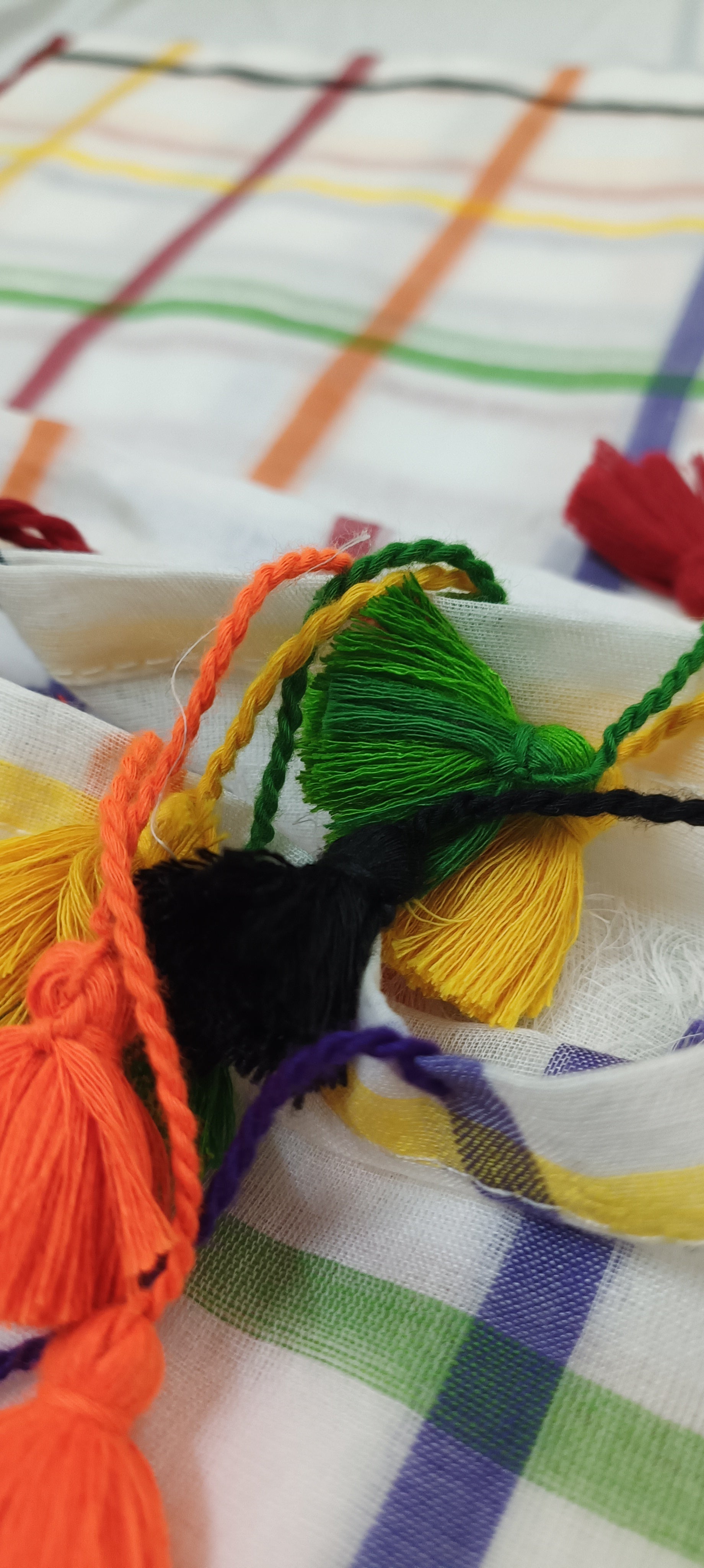 RANGREKHA is a vibrant white cotton saree adorned with rainbow-colored windowpane checks and a multi-hued border. A lightweight stunner from the HIYA Selection, this saree is perfect for women who love comfort with personality. Its playful stripes and airy drape make it an ideal pick for brunches, get-togethers, and joyful everyday wear