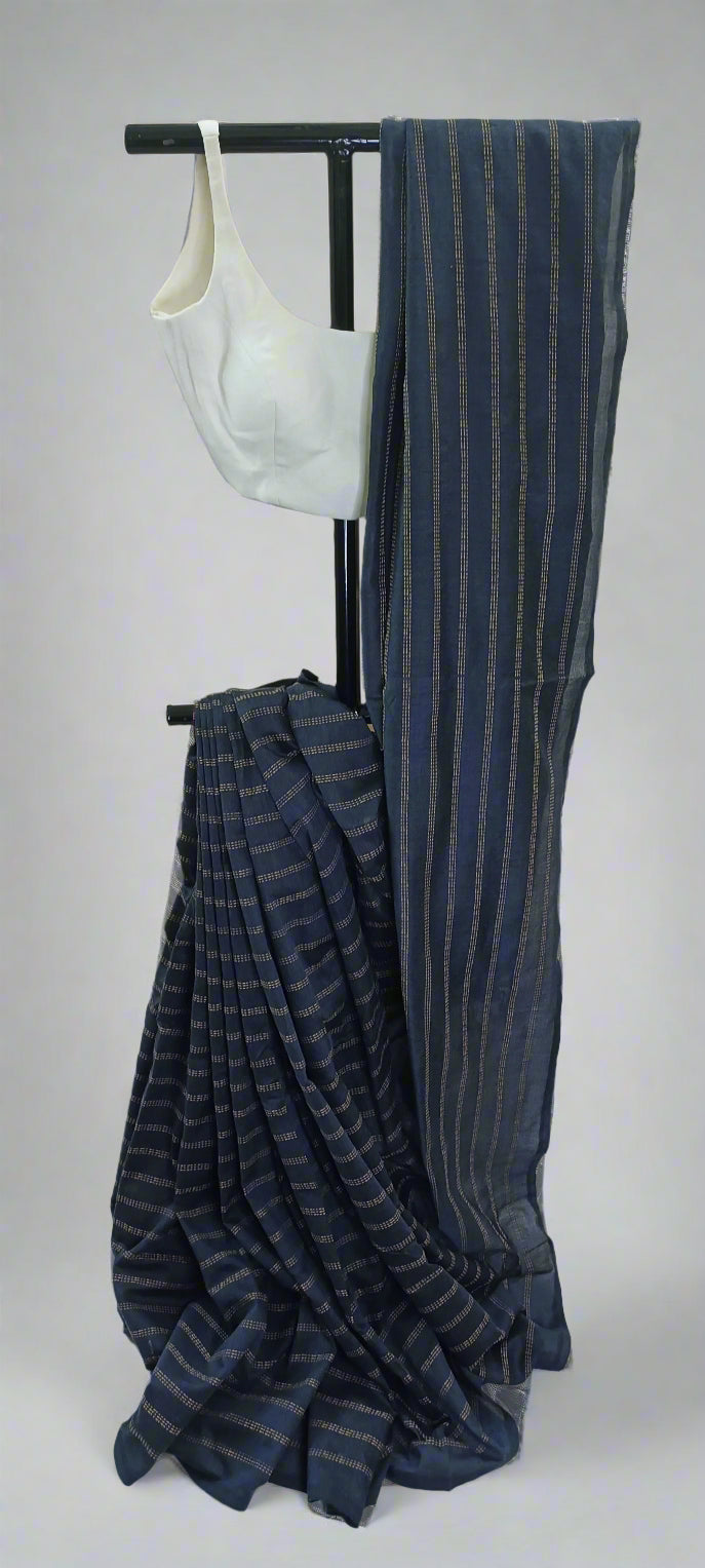 Embrace elegance with HIYA – Twilight Moss, a handwoven kantha stitch saree in deep indigo cotton, featuring rhythmic running stitches in off-white and a bold, multitone pallu in moss green and plum