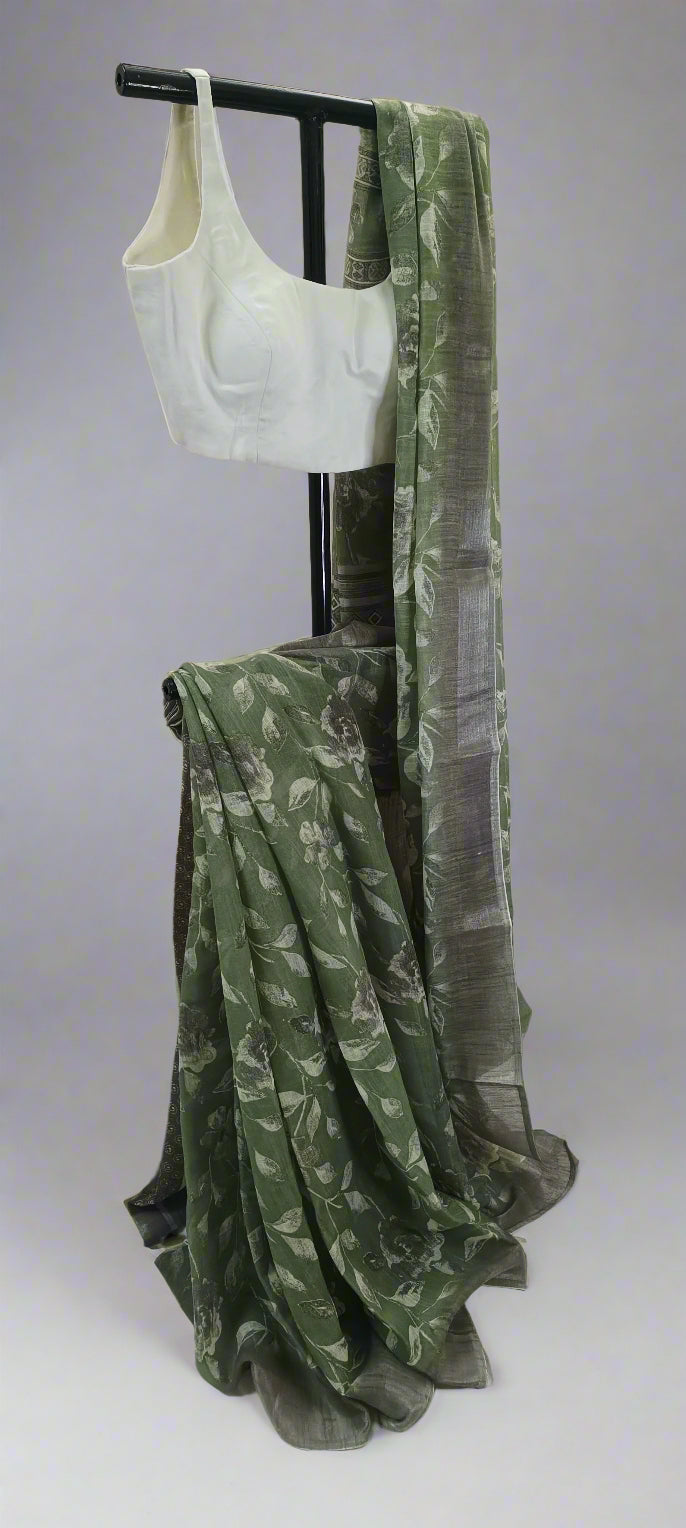 Explore grounded elegance with HIYA – Vanashree, a linen saree that blends comfort with quiet sophistication. Featuring digitally printed sepia-toned florals and foliage on a green base, the saree is framed by a charcoal gray woven border—perfect for elevated everyday wear, subtle festivities, or mindful gifting
