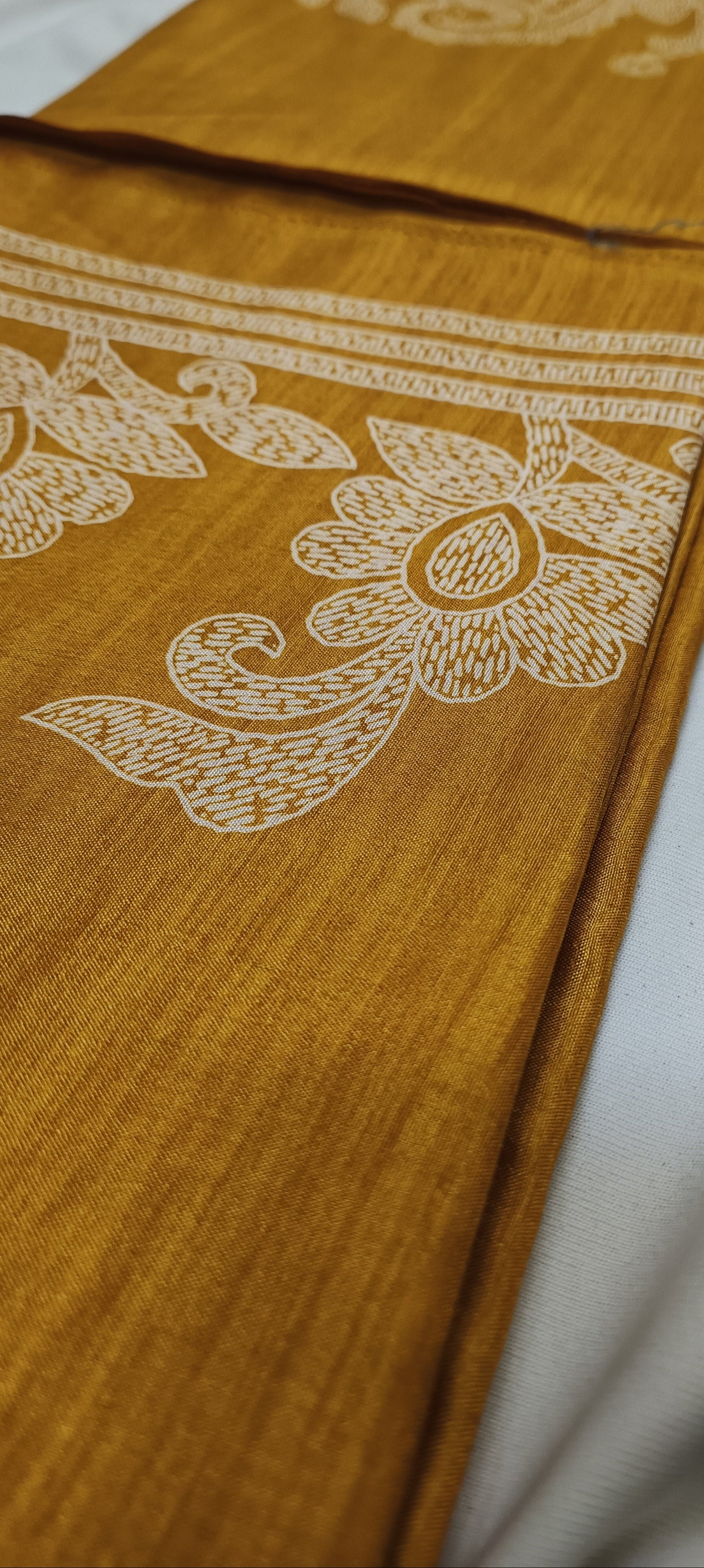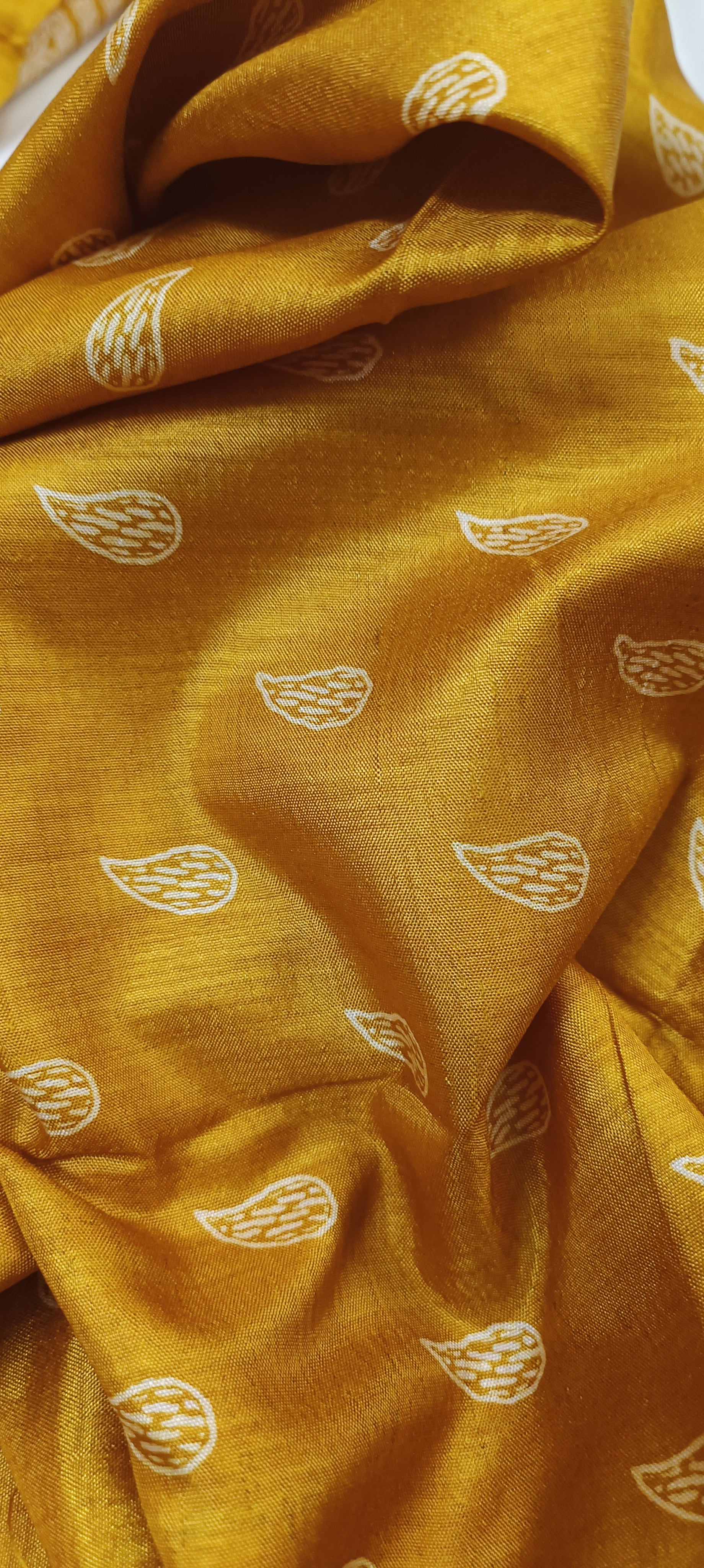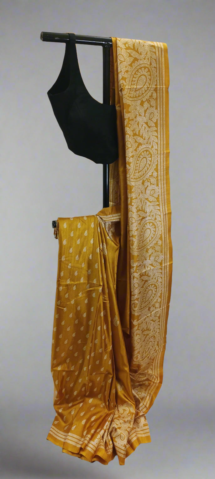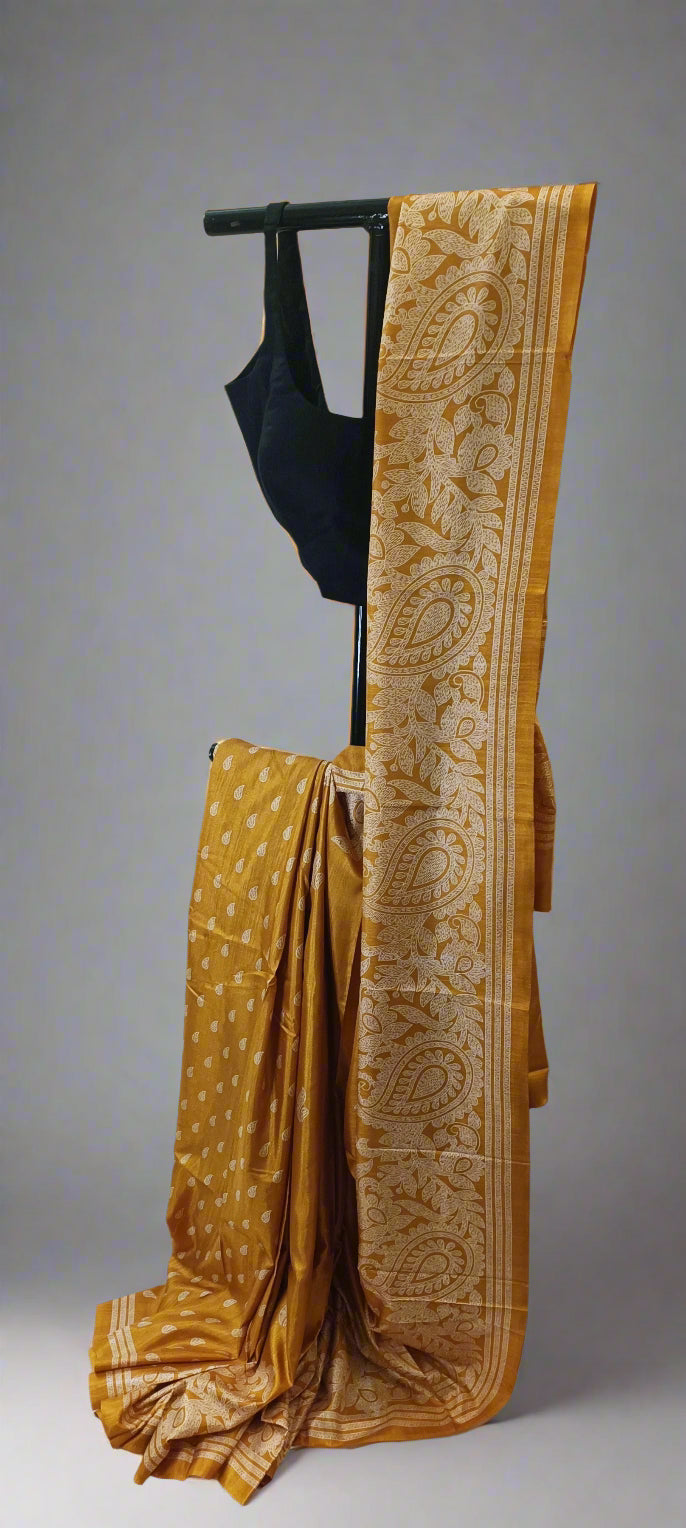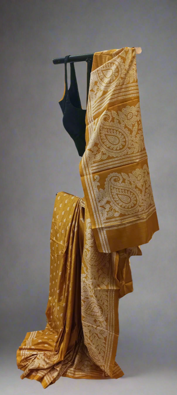 Step into the warmth of heritage with MALA – Amaltas Gold, a luxurious handloom saree crafted in a pure silk and cotton blend. This mustard-ochre drape carries intricate white kalamkari-inspired motifs and paisleys, hand-printed with care and balance.