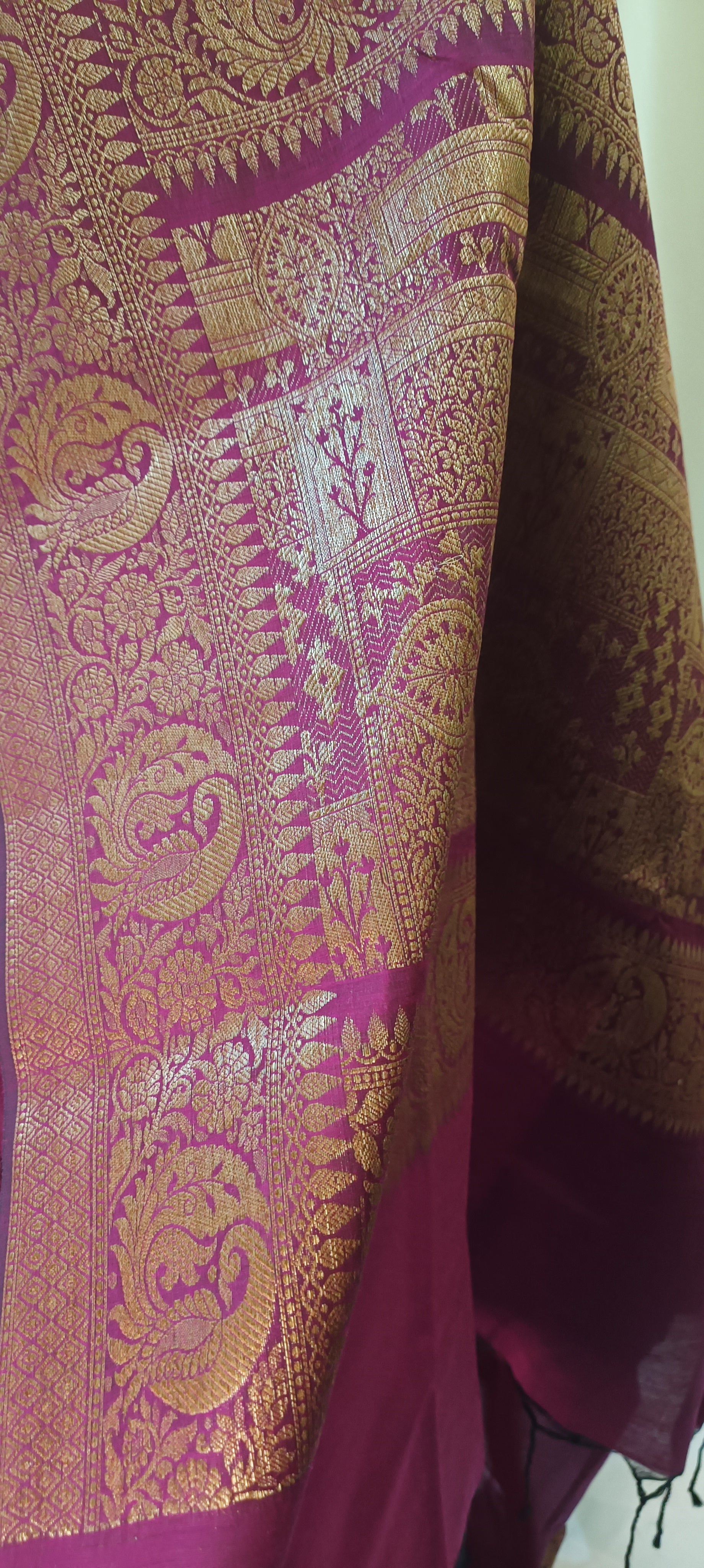Wrap yourself in heritage with MALA – Kaavya Kansa, a deep maroon silk cotton saree enriched with antique gold zari borders. This drape whispers of temple bells, old-world charm, and heirloom elegance. Perfect for evenings of quiet dignity or festive grace, its weightless silk cotton fabric is as breathable as it is noble