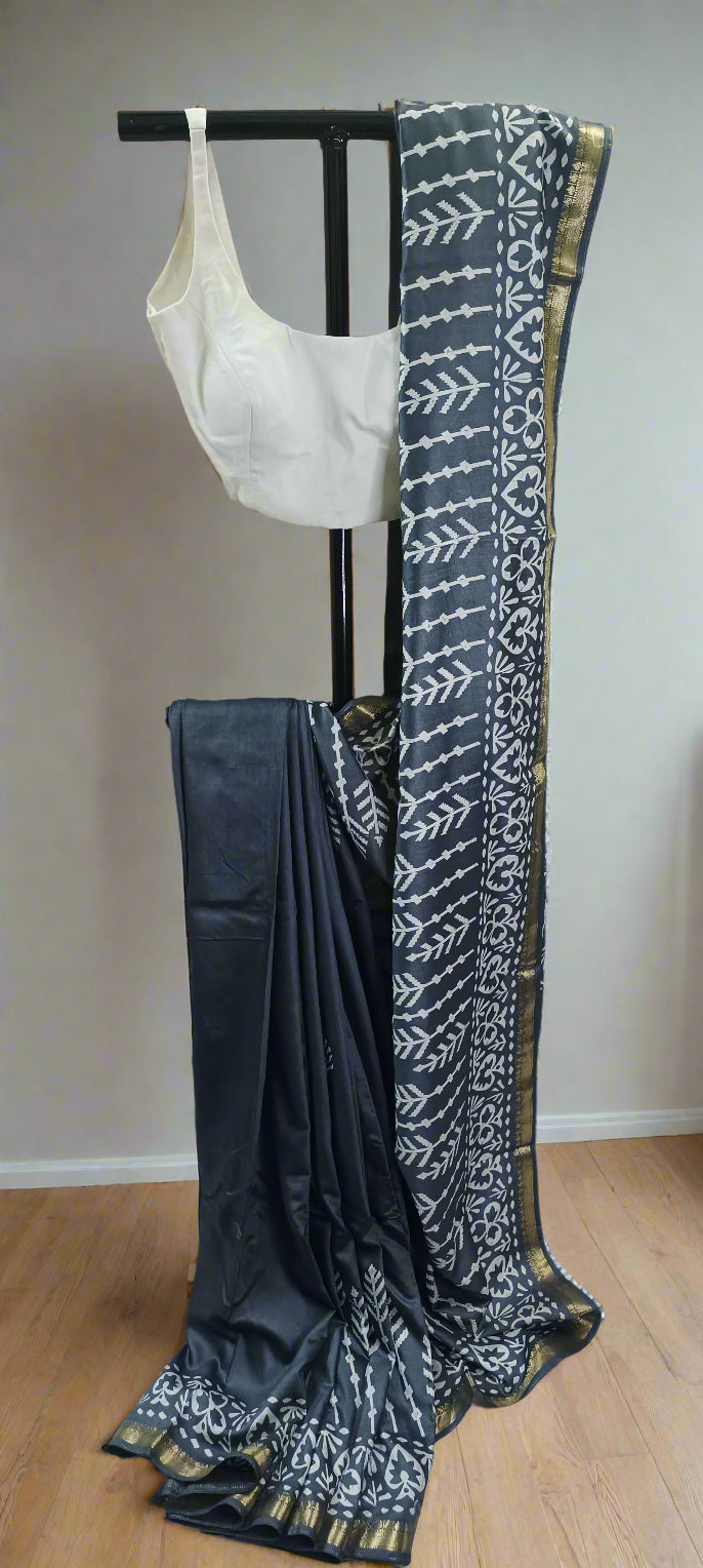 Discover sacred stillness in MALA – Shanta Neel, a Maheshwari handloom saree from the MALA Selection. This slate-blue drape carries hand block printed ivory motifs inspired by temple gardens and sacred geometry. Finished with a rich gold zari border, this saree is perfect for spiritual gatherings, mindful gifting, or soulful everyday wear
