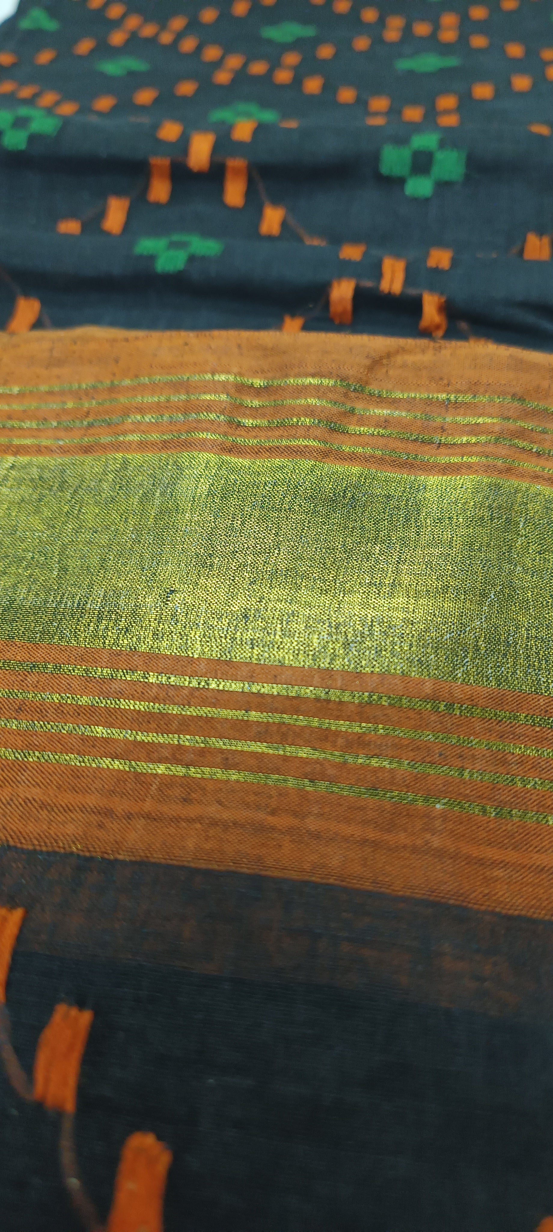 Wrap yourself in the soulful cadence of twilight with MALA – Shondhya Raag, a handwoven Dhakai Taant saree from Bengal’s skilled looms. The deep indigo body is rhythmically dotted with orange and green threads, while the pallu features latticework embroidery in resham — geometric, grounded, and timeless.