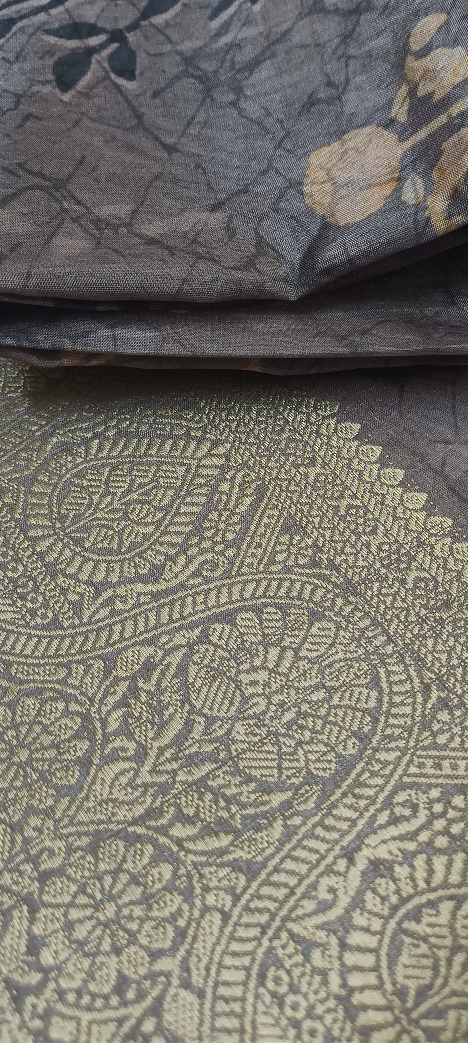 Color - Deep twilight plum with beige and gold floral motifs