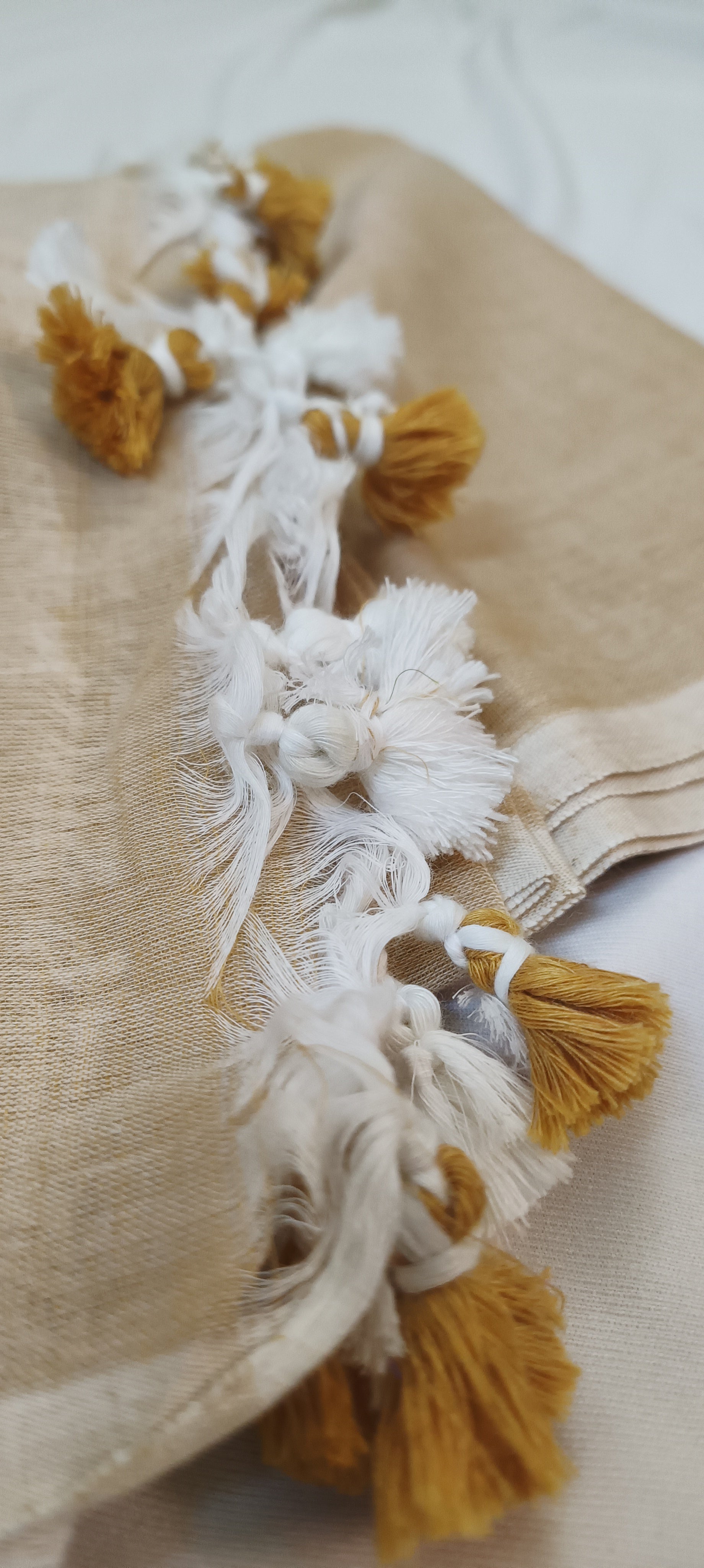 Accented with delicate dual-tone tassels in ivory and mustard, the drape blends minimalism with playful earthiness. Designed for both everyday wear and quiet gatherings, Butter Dust is a celebration of soft power and effortless elegance