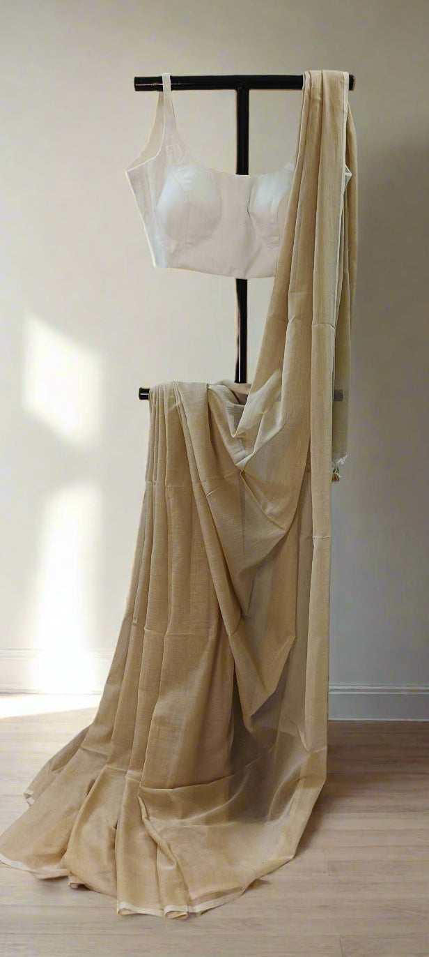 RIMI – Butter Dust is a handwoven mul cotton saree in a warm buttery beige tone, enriched with soft golden undertones. Light as air and soft on the skin, this saree is crafted from breathable handloom mul cotton, making it a perfect companion for summer days, long conversations, and moments of mindful grace.