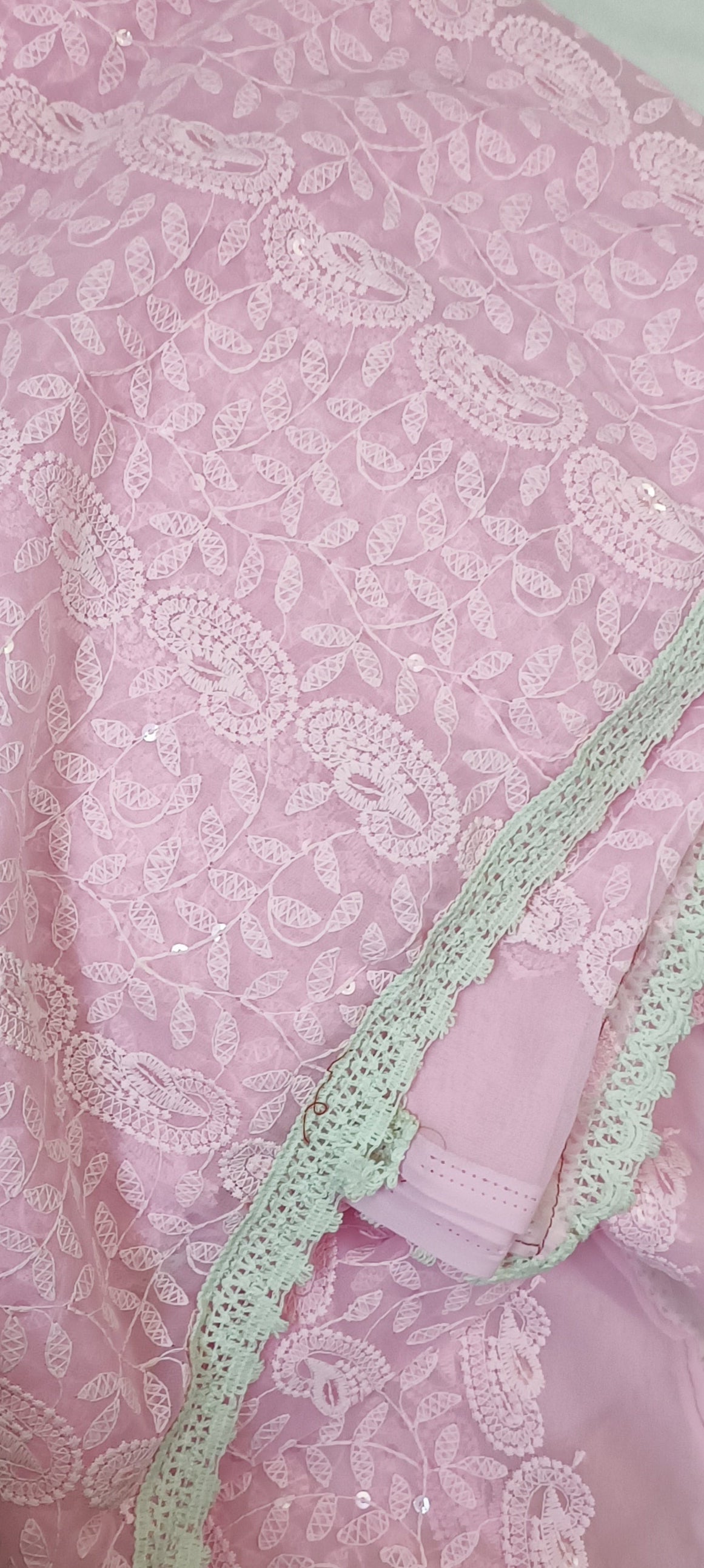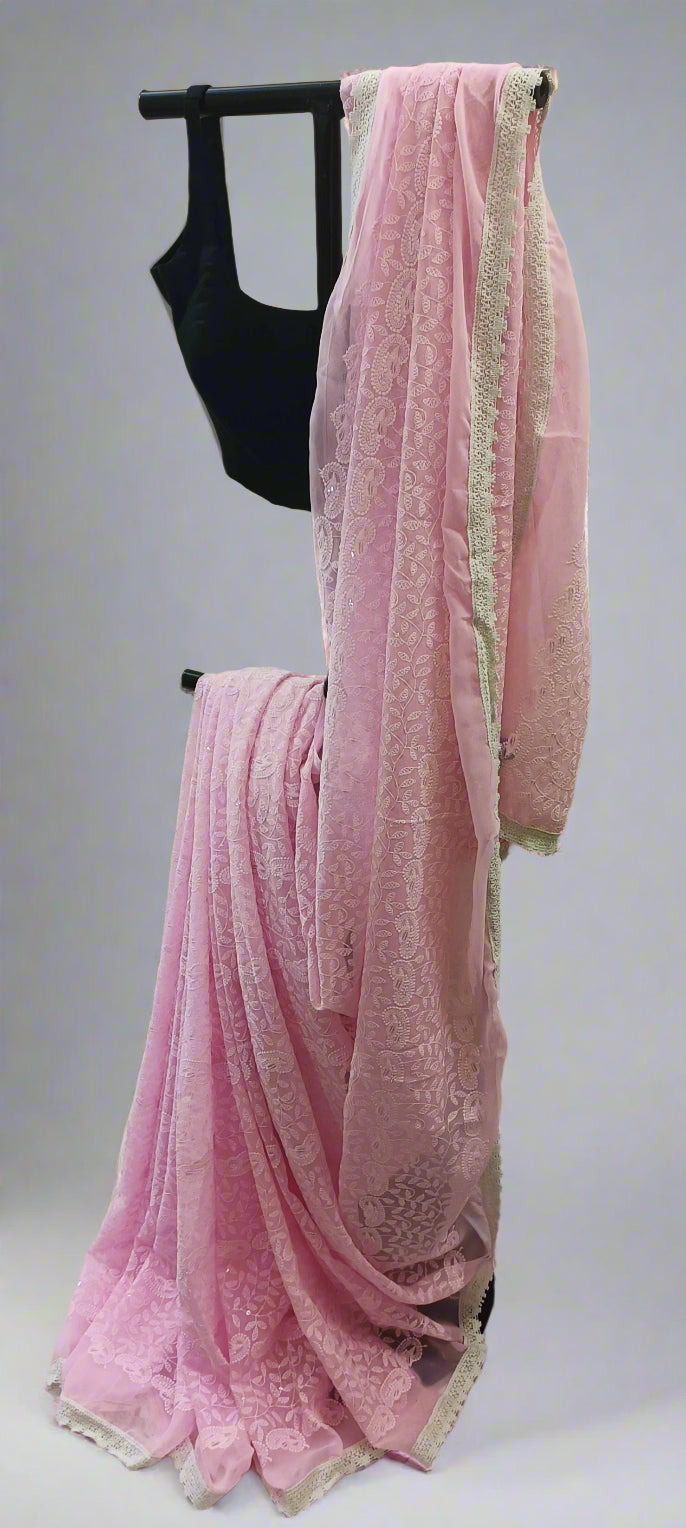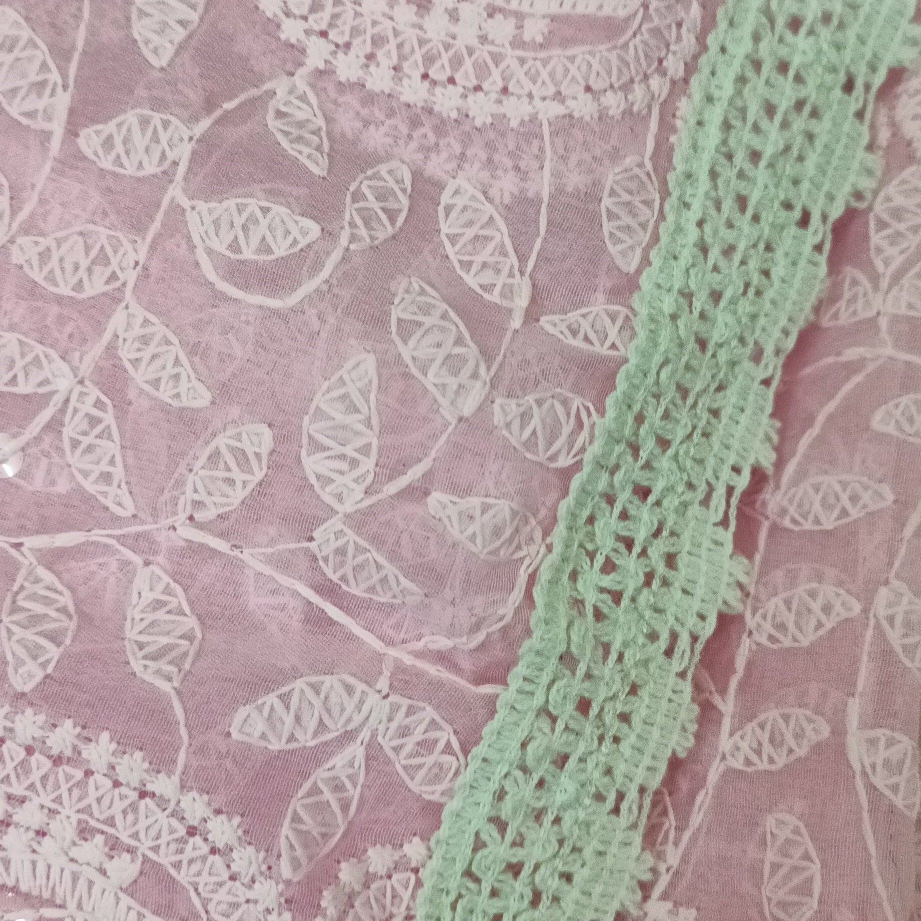 Elevate your elegance with Gulaabi Reva, a delicate pastel pink saree in airy net fabric, adorned with exquisite white Chikankari embroidery. Gracefully finished with a soft crochet lace border, this saree flows like light, making it perfect for brunches, get-togethers, and intimate festivities