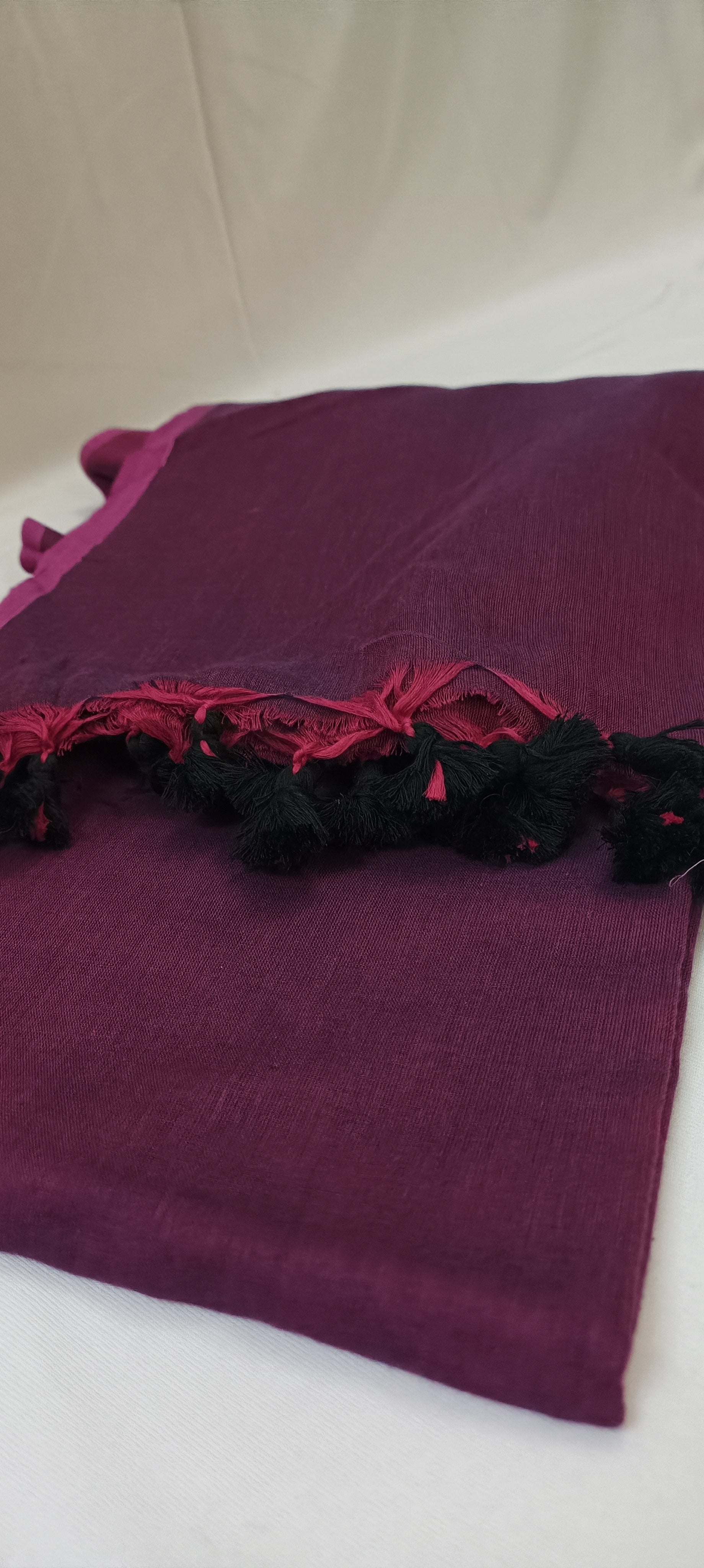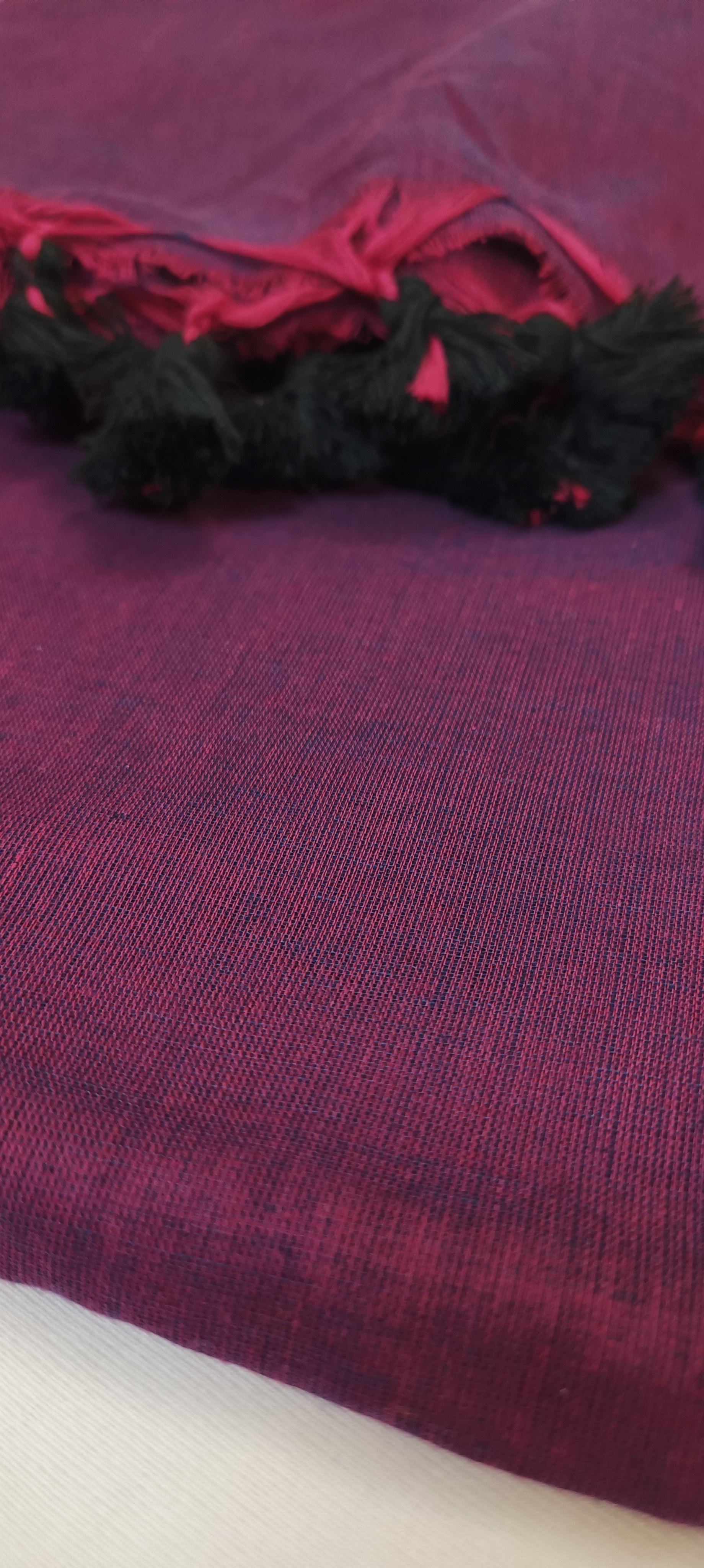 Its contrasting black tassels with magenta threads offer a bold finish to an otherwise fluid and moody drape. Perfect for dusk-lit gatherings, slow city evenings, or statement minimalism, Jamun Noir speaks volumes in silence