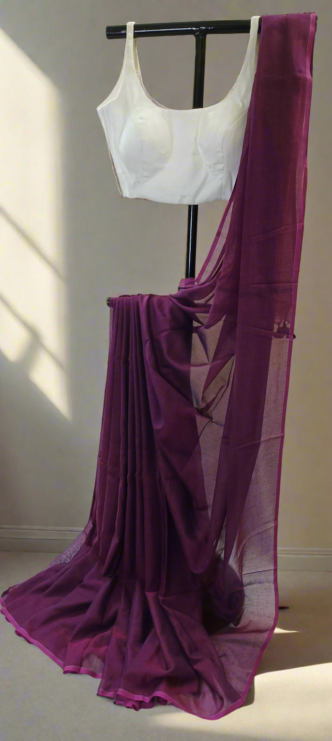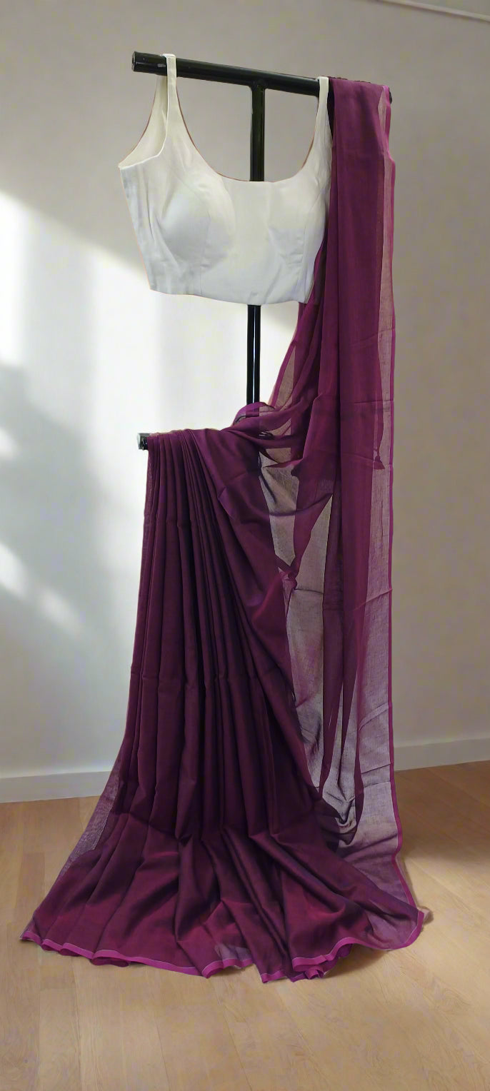 RIMI – Jamun Noir is a deep magenta mul cotton saree, tinged with plum undertones and cloaked in quiet drama. Woven by Eastern India’s master artisans in handloom mul cotton, it is featherlight, sheer, and soft — a fabric that breathes like second skin and drapes like a poem.