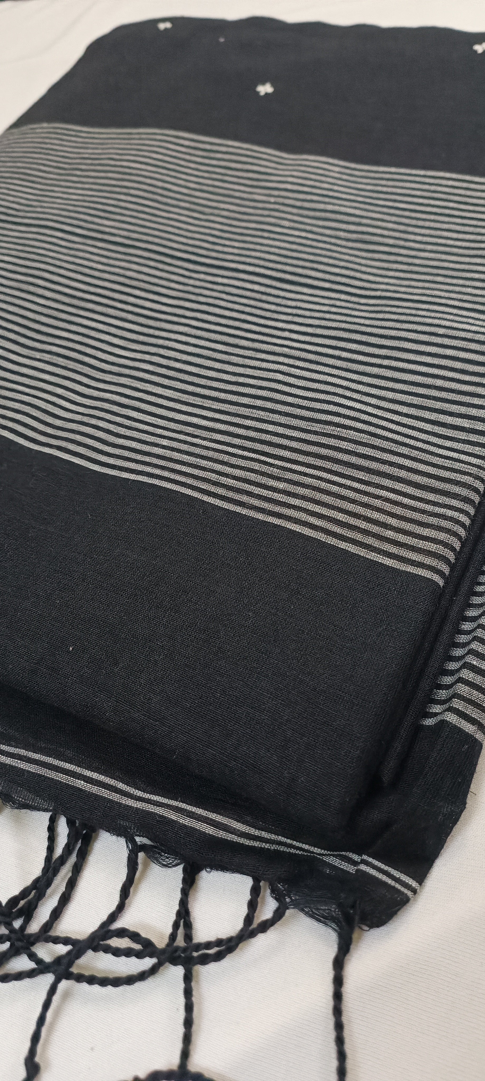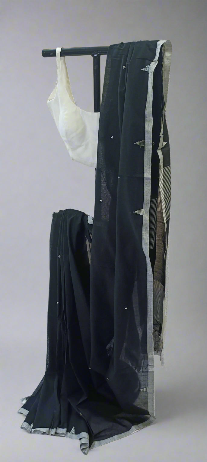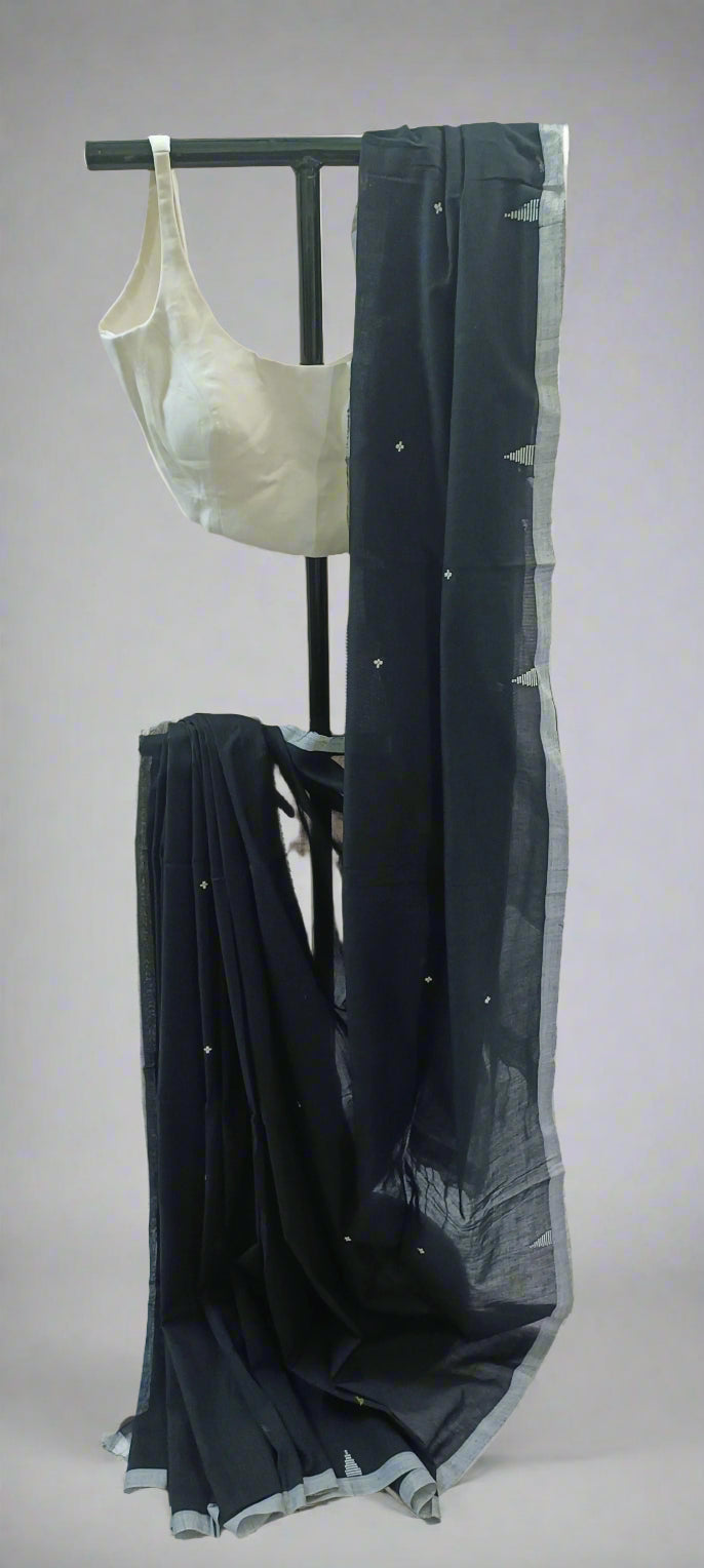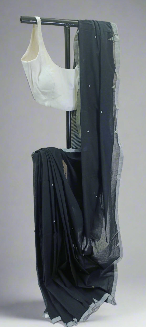 Ground yourself in quiet power with RIMI – Kaali Raai, a handloom cotton saree in deep black. With delicate white buti work and silver-striped pallu, this saree balances raw earthiness with elegant restraint