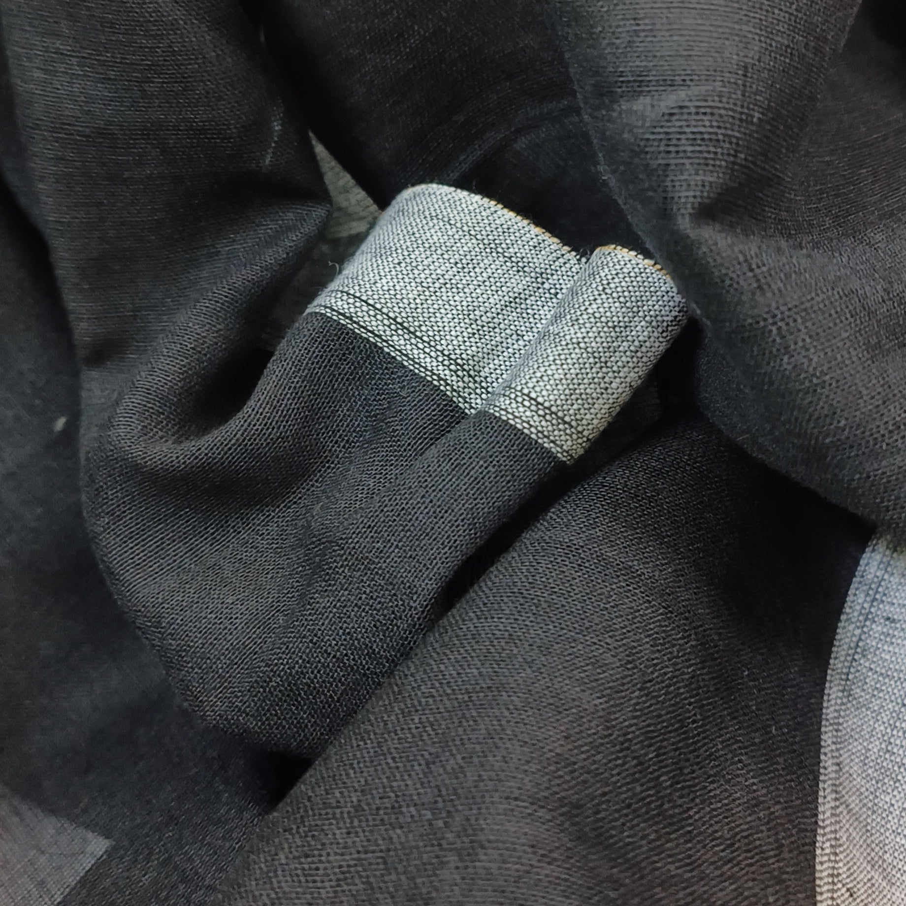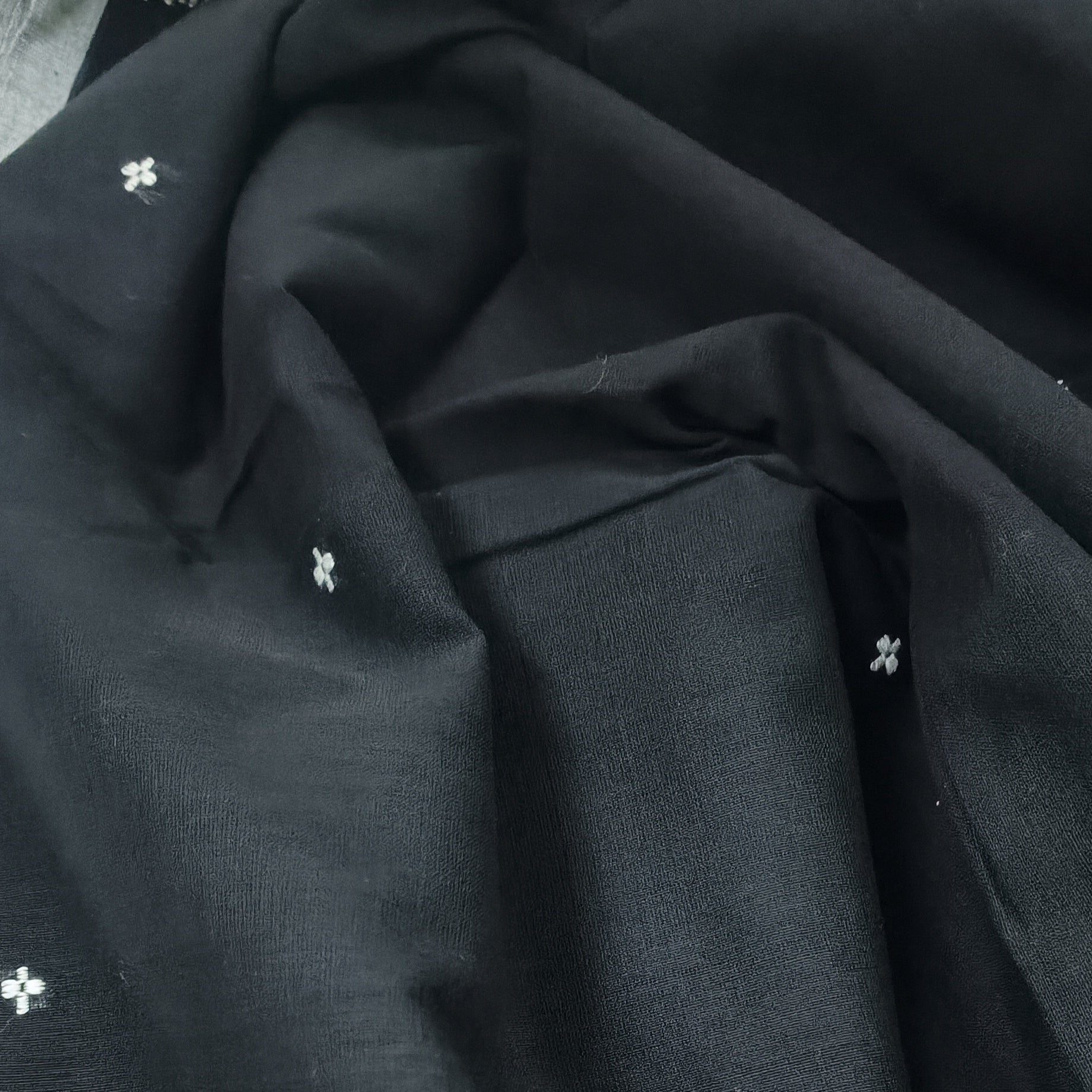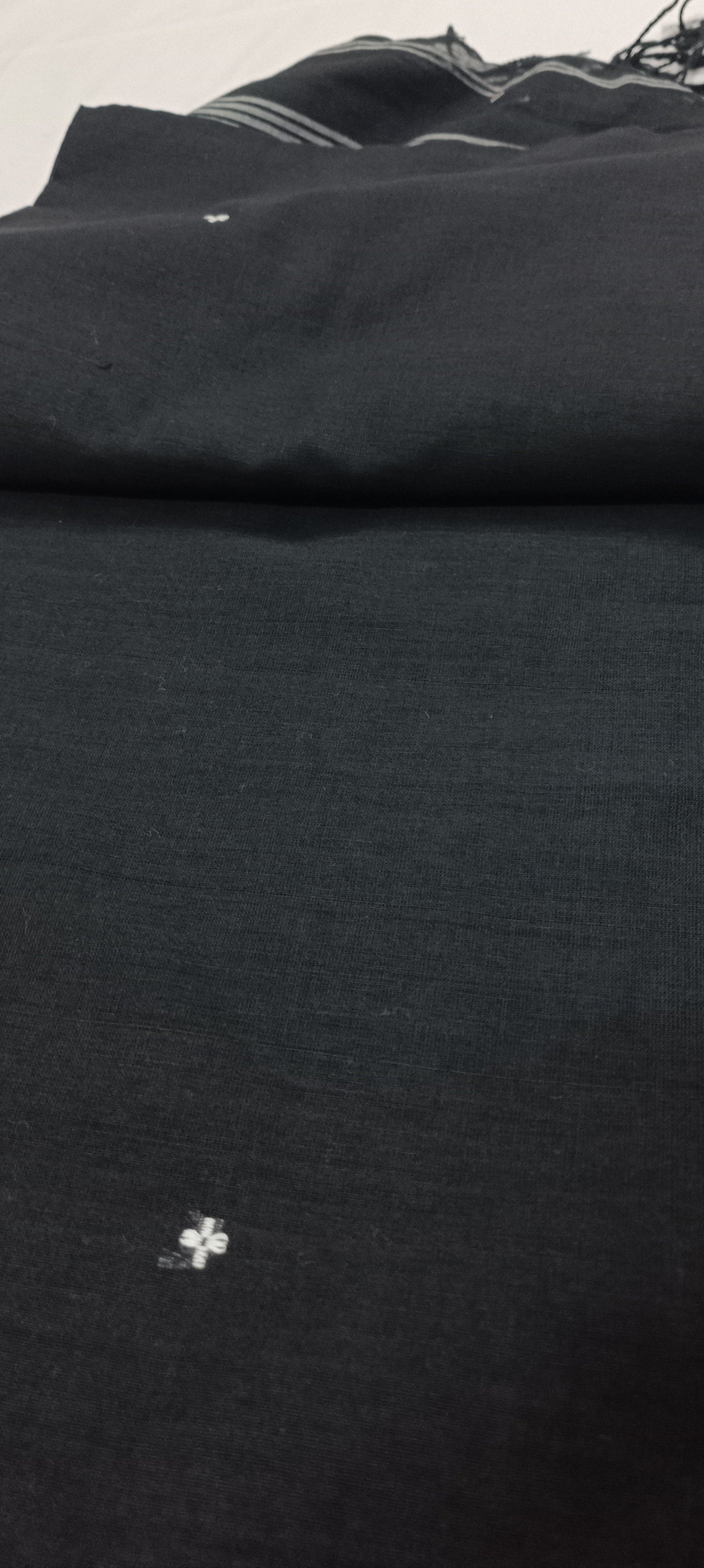 Ground yourself in quiet power with RIMI – Kaali Raai, a handloom cotton saree in deep black. With delicate white buti work and silver-striped pallu, this saree balances raw earthiness with elegant restraint