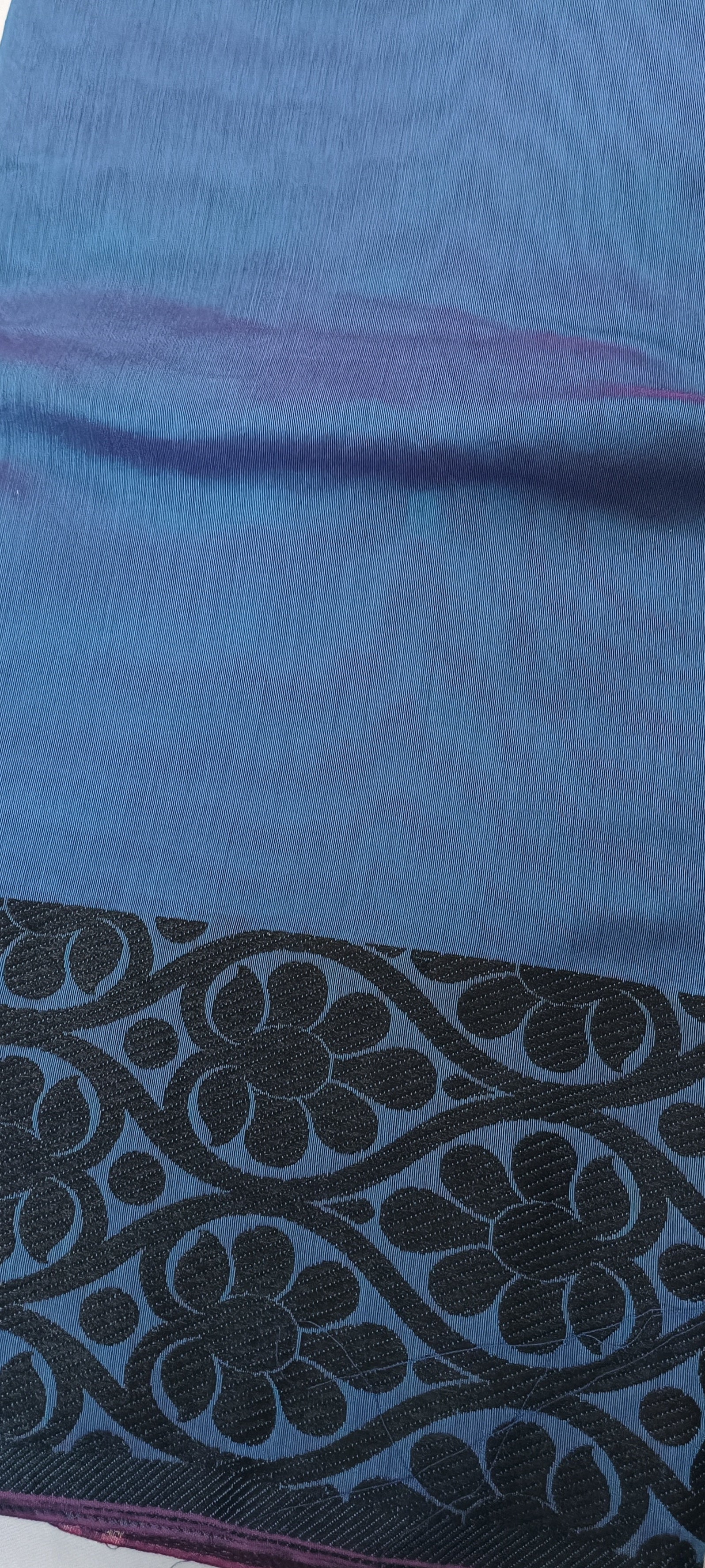 Color - Deep twilight blue with plum pallu accents and black floral borders