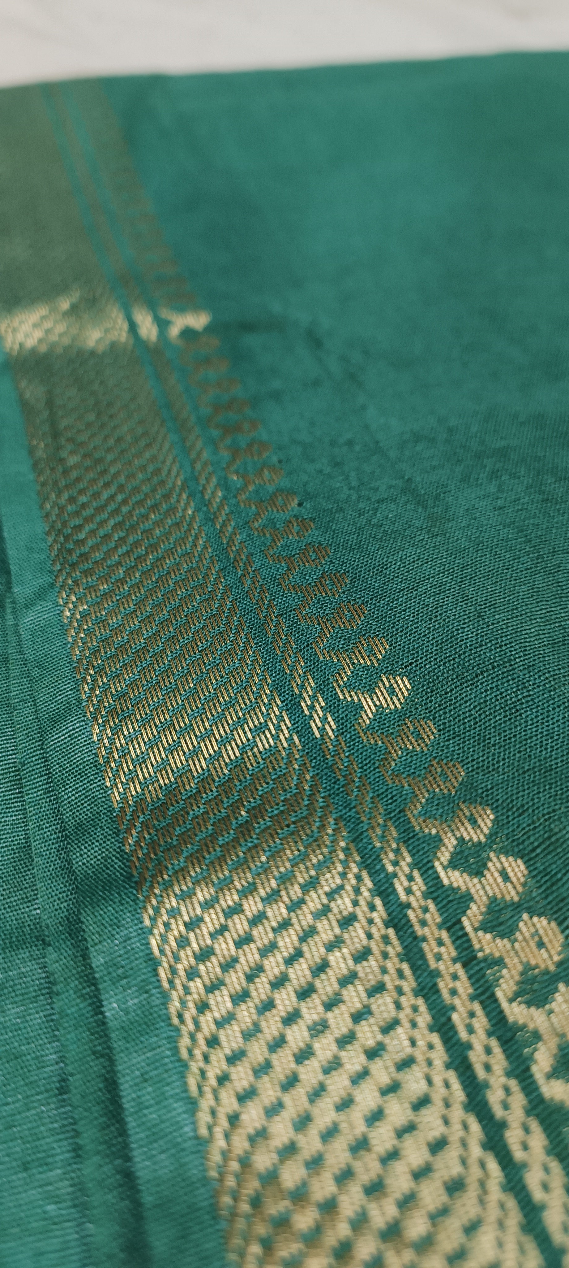Step into effortless southern elegance with RIMI – Teal Gold, a pure Mangalgiri cotton saree. With its signature fine weave, zari-lined border, and rich teal body, this saree is a modern heirloom — airy, breathable, and full of cultural grace.