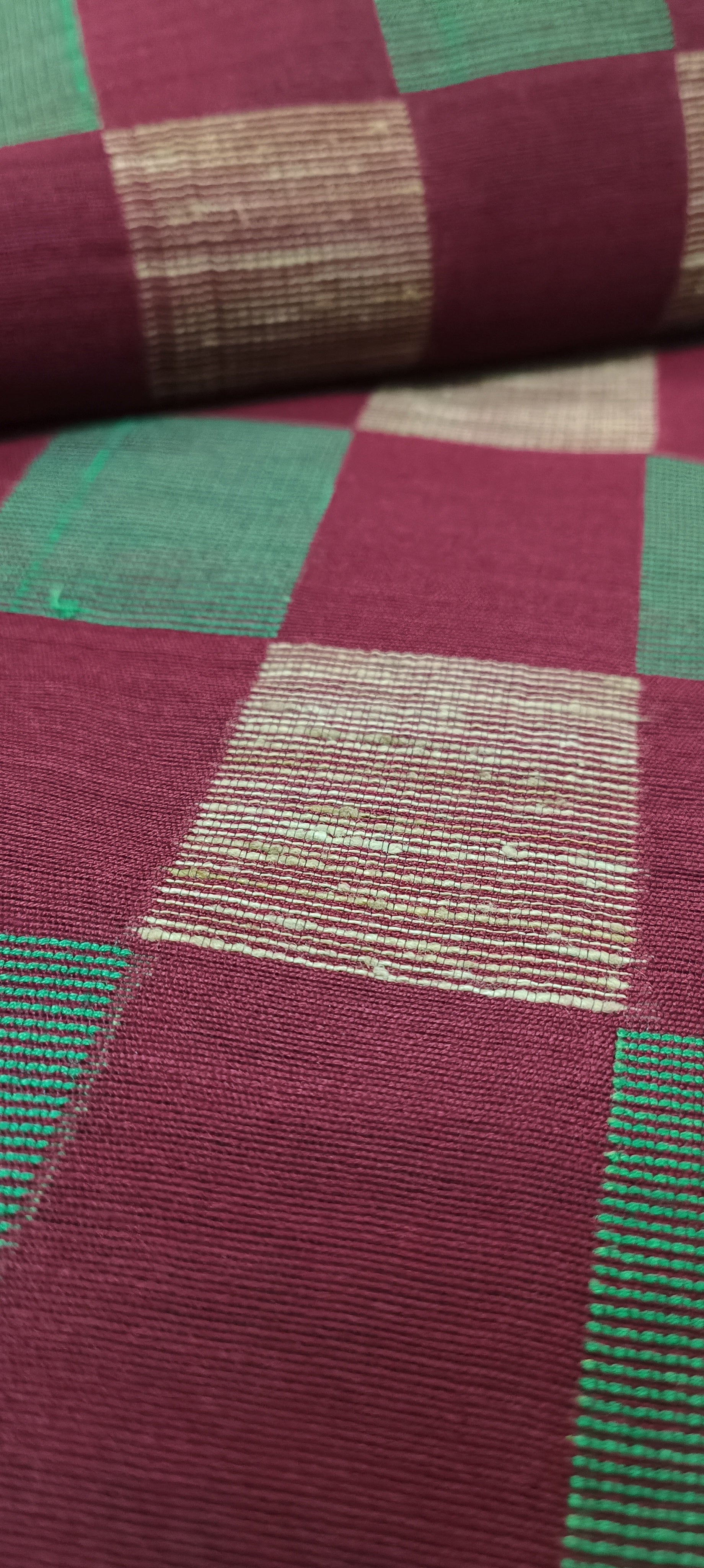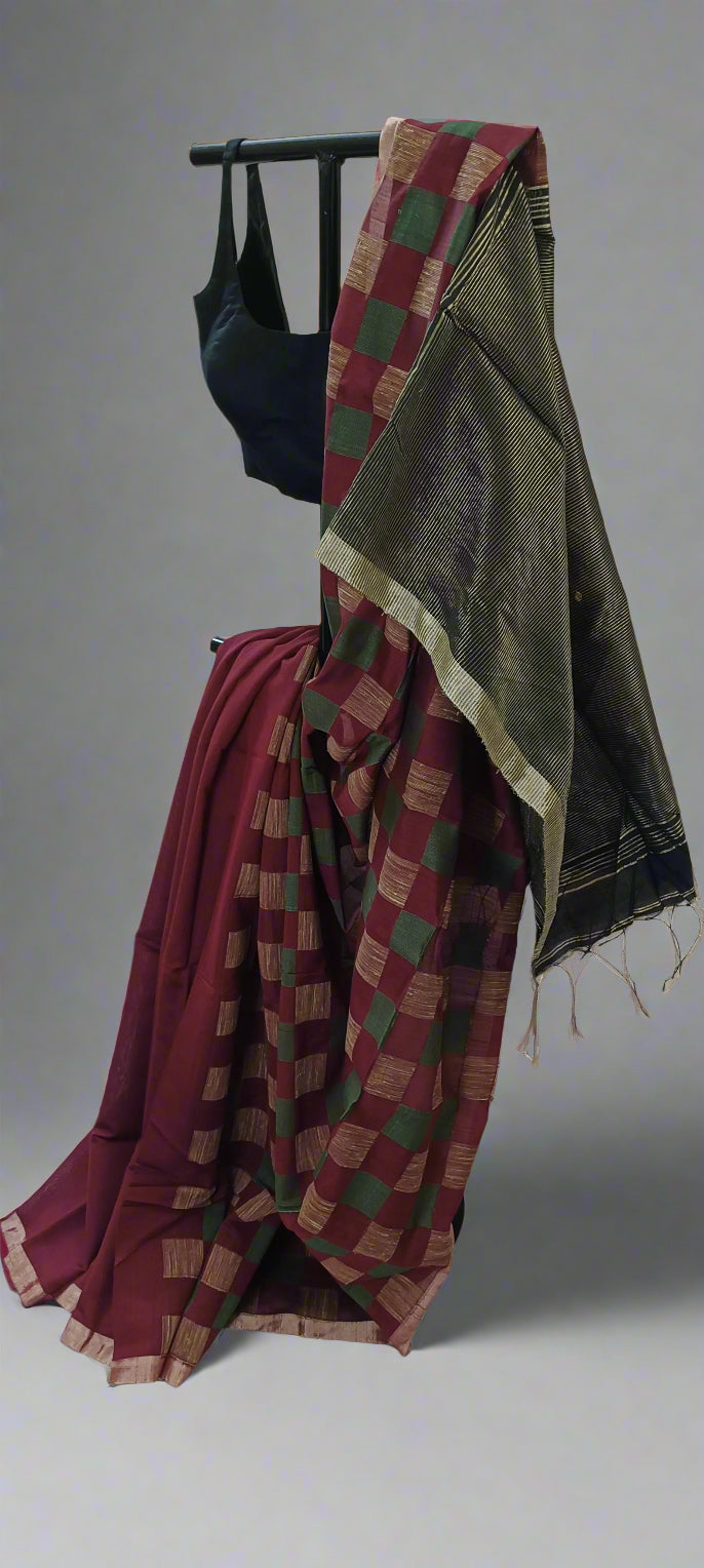 The MALA – Temple Moss & Madder is a heritage-inspired cotton saree woven for the woman of quiet dignity. With a deep madder maroon body and checkered pallu in forest green and golden beige, this saree channels classic South Indian artistry with a modern minimalism